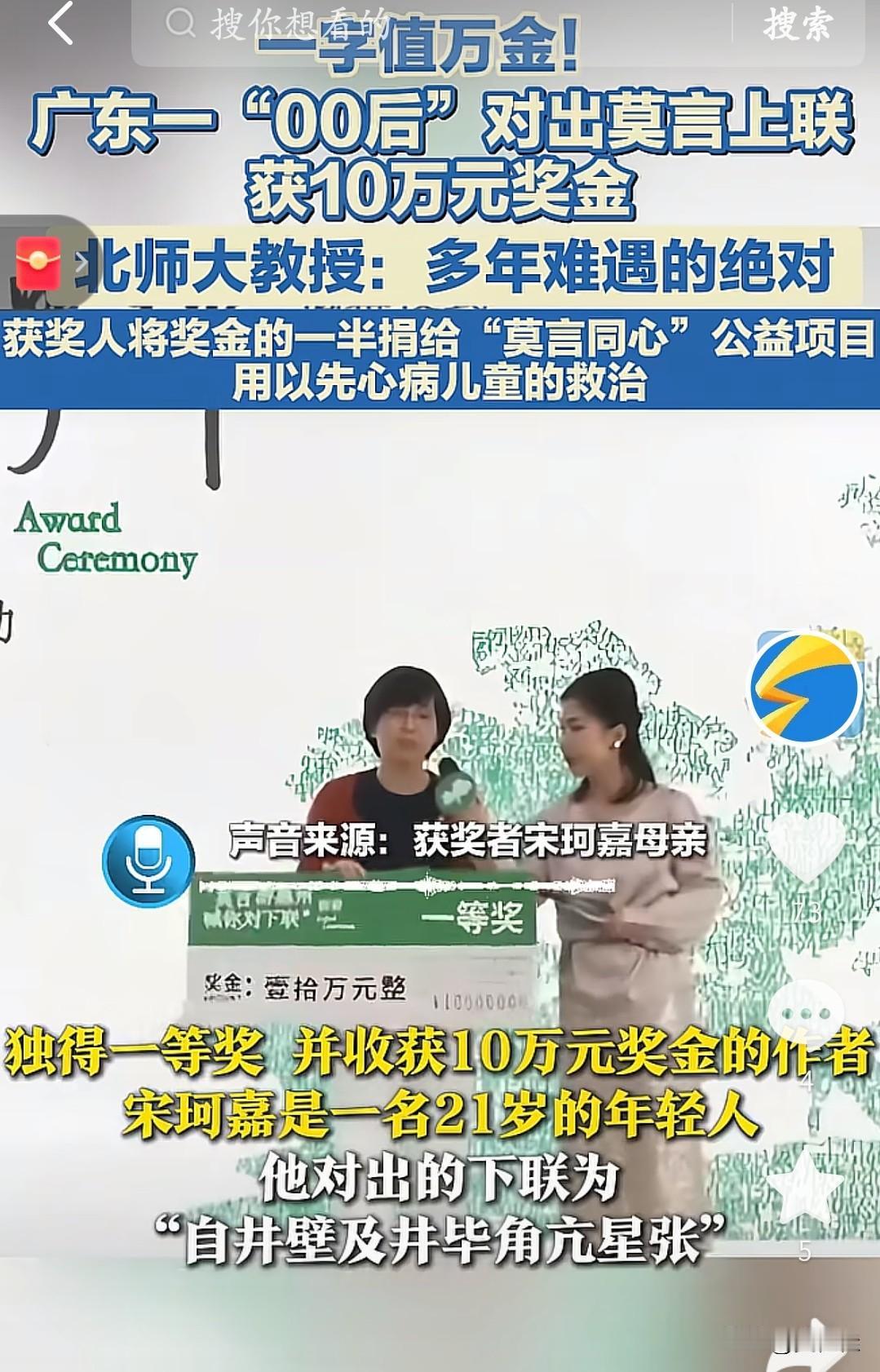 对出莫言上联“从南阳到南洋根深叶茂”的00后是21岁的宋珂嘉,他凭借下联“自井壁及井毕角亢星张”在全网征集活动中独得一等奖,斩获10万元奖金及莫言亲笔书法作品。 宋珂嘉的下联以二十八星宿文化为内核,用“自……及……”的结构呼应上联“从……到……”,“井”字重复与上联“南”字重复形成巧妙对应,被北京师范大学教授欧阳江河盛赞为“多年难遇的绝对”。 颁奖时他因故未到场,由母亲代领奖项,其母亲透露,他决定将奖金的一半捐给“莫言同心”公益项目,用于先心病儿童的救治,尽显青年的社会责任感 。