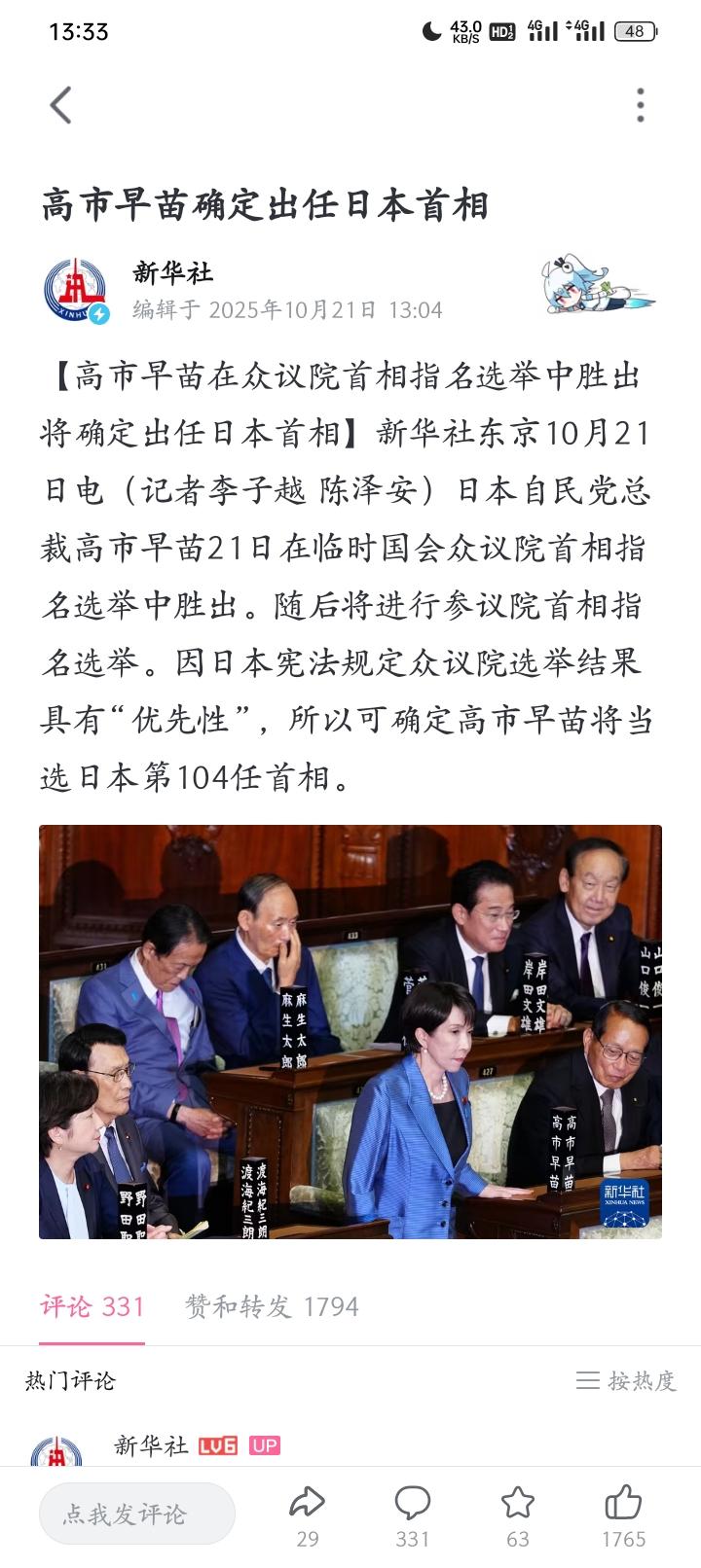 报!早苗桑成功上位! 日本政坛变天!高市早苗打破男性垄断,成首位女首相。她被日本媒体称为“女版安倍”,是日本右翼代表人物,曾11次参拜靖国神社。 之前自民和公明联合,还能有公明踩刹车,维新会这**上来,那是轰油门的 维新主张,地方分权,大阪升都,修史,修仙,排外,占岛 真真好起来了,干吧高市阁下!高士早苗 日本新首相 日本女市长