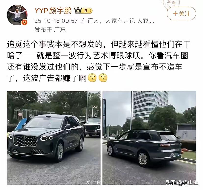 破案了! 原来这辆宾利版的新能源车型, 是官宣造车的追觅车型! 在这里奉劝追觅一句,如果不老老实实造车的话,尽量不要来沾边!否则下场会比众泰还惨! 现在的车型一点原创设计都没有,已经引起了很多人反感,如果固执一见,会不会影响到扫地机业务就不好说了! 我之前家里用的就是追觅的扫地机,说实话,很一般,扫地经常被一些纸片笔壳缠绕,识别不了,一个拖盘下面的拖布老是粘不住,换了拖布换了托盘也是这样,不知道什么原因。 关于追觅现在造车,我反正是不买!