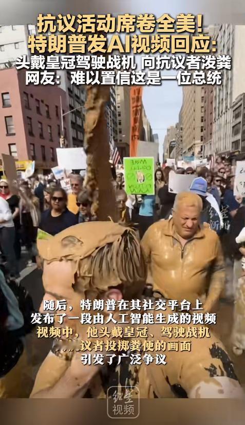 辣眼睛!美国50州2600地爆发抗议,组织方声称参与人数接近700万人,特朗普发布AI视频回应:头戴皇冠开战斗机,向抗议者洒大便!网友:难以置信这是一位总统做出来的事儿! 麻烦看官们右上角点击一下“ 关注”,既方便您进行讨论和分享,又能给您带来不一样的参与感,感谢您的支持! 当地时间18号,那天的美国几乎每一座城市都在喊。 人们走上街头,举着各种标语,怒气、讽刺、无奈混成一片,50个州、2600多个集会地点,从纽约到旧金山、从芝加哥到奥斯汀,主办方说这场全国性示威吸引了近700万人。 如果数字属实,那是过去半个世纪里美国最大的一次集体上街! 地铁出口被人群塞得水泄不通,举牌的年轻人高喊民主不要君主制,旁边的老雇员举着欠薪的抗议者,脸上写着无声的愤怒。 有人在台阶上弹吉他,也有人分发热咖啡给冻得直哆嗦的同伴,警察拉起封锁线,却也懒得阻止,更多时候是维持秩序。 纽约警察局说光这一座城市就有十多万人参与,而在全国,队伍像潮水一样漫过街头。 这股怒气不是一夜之间冒出来的,美国联邦政府因为预算僵局停摆已经快三周,很多公共机构关门,数十万雇员拿不到工资。 有人本来在机场工作,现在只能去参加抗议,笑着说反正闲着也是闲着,再往深里说,不满积累已久,通胀、医保、移民政策、关税争议,几乎每一项都有人不爽。 民主党和共和党在国会互掐,老百姓夹在中间,谁也没得好日子。 有人说,这不是一次单纯的政治抗议,而是生活被逼到墙角的爆发,食物贵了,房租涨了,政府还在吵架,那种情绪不喊出来,憋都能憋出病。 就在抗议的浪潮达到高潮时,美国总统特朗普照例选择了他最熟悉的战场——社交媒体。 18日晚,他发布了一段AI生成的视频:自己头戴金冠,从白宫阳台挥手,然后化身驾驶战机的君王,向街头的抗议者投放粪便! 这段视频让全国哗然,有人笑称这大概是史上最昂贵的自嘲,也有人气得摔手机,总统在拿人民开玩笑。 可特朗普显然乐在其中,他一向擅长用戏剧化的方式转移矛盾,从推特治国到如今的AI治国,这位总统似乎从没打算让政治显得无趣。 更有趣的是,这不是他第一次玩AI,早前他发过一段奥巴马被捕的虚构画面,又转过副总统发布的那种奇葩视频,他成了受万民跪拜的“王”。 有人批评他滥用技术煽动情绪,但特朗普团队却说这只是幽默讽刺,是一种新媒体语言,事实是,这种幽默让愤怒的美国人更觉得被冒犯。 抗议浪潮甚至蔓延出了美国。巴黎、柏林、罗马和斯德哥尔摩的美国使馆外,都有民众举起标语声援,“我们没有国王”、“民主不该是表演”成了跨国口号。 回到美国本土,抗议持续,特朗普则选择远离喧嚣,据报道,他在17日就飞去了佛罗里达的海湖庄园过周末。 阳光、泳池、私宴,对比那些在寒风中举牌的民众,形成一种近乎荒诞的对照。 但这就是当下的美国:一边是普通人的愤怒,一边是权力者的娱乐,一边是街头的寒风,一边是社交媒体里的热闹。 AI成了政治的玩具,愤怒成了网络的素材,而真相在无数次转发和嘲笑中被稀释。 也许这次抗议能改变的不会太多,可七百万双脚同时踏上街头的声音,还是在提醒人们:民主不是自动运行的机器,它需要被守护、被争取。 对此,大家觉得特朗普发布的ai视频真的合适吗?