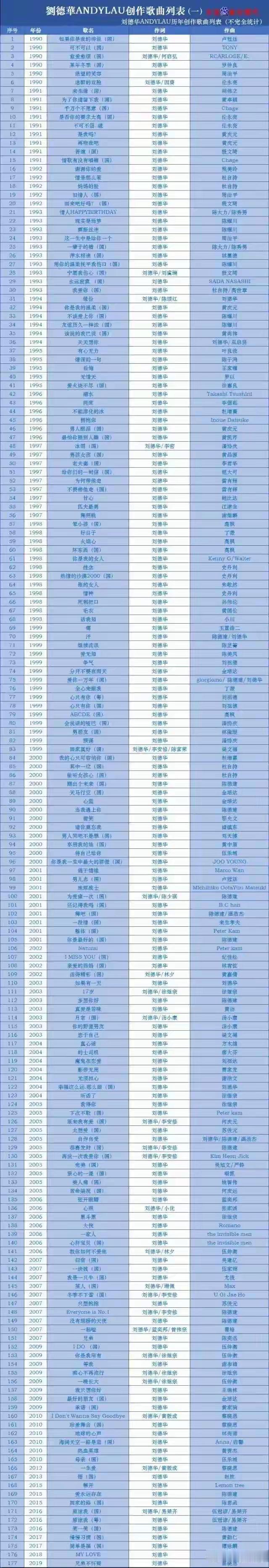 @唐泪不熟悉别人就不要乱编写数据 刘德华先生自己作词的歌曲有接近200 不要把
