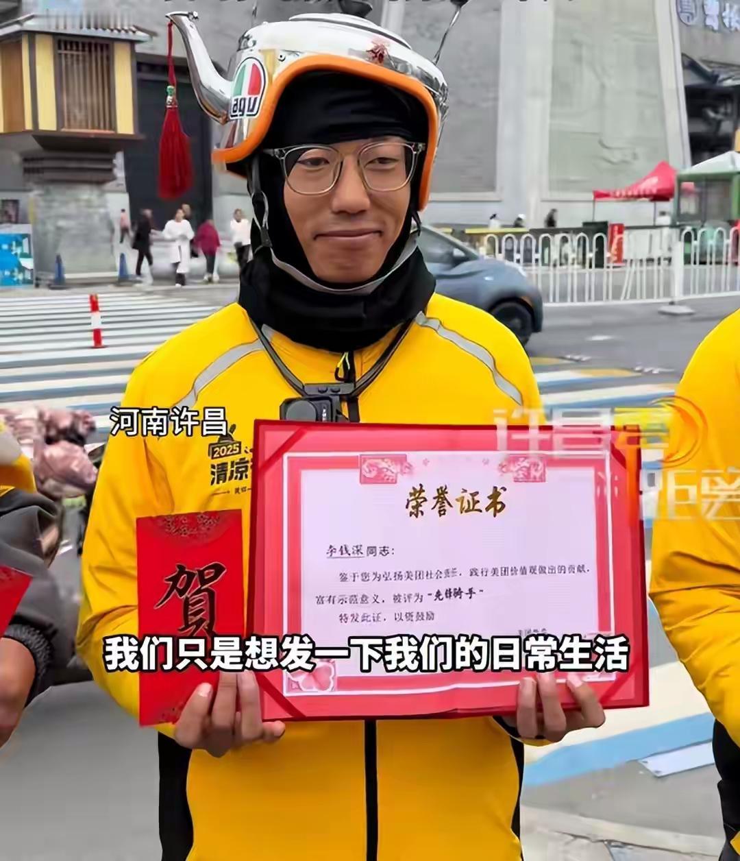 “这也太戏剧了!”河南许昌,一对小情侣深夜在护城河边吵架,男生情绪崩溃突然冲向河边欲跳河,女生也跟着躺马路中间要轻生。四位外卖小哥扔下电动车,一路狂奔将两人先后拦下,网友看完监控笑翻:头盔居然是茶壶和秦始皇冠冕! 据外卖小哥说,当晚他们正蹲在路边等单,闲着无聊就围观小情侣拌嘴。谁知男生越吵越激动,突然百米冲刺奔向河边。带头的小哥戴着“皇帝帽”头盔,边跑边喊同伴“壶”,四人瞬间开团,一把将男生按在岸边。 刚松一口气,女生又躺到车道中央不动弹。小哥只好把电动车横成一排,打双闪当保护墙。谁料男生被拉回后又受刺激,再次冲向河对岸。四人只好掉头再追,边跑边吐槽:“送外卖都没这么累!” 警方赶到后把情侣带走,平台次日给四位小哥颁发“先锋骑手”称号并奖4000元。茶壶小哥却喊话:当时还有三位路人帮忙,希望找到他们一起平分奖金。网友直呼:头盔搞笑,格局更大!