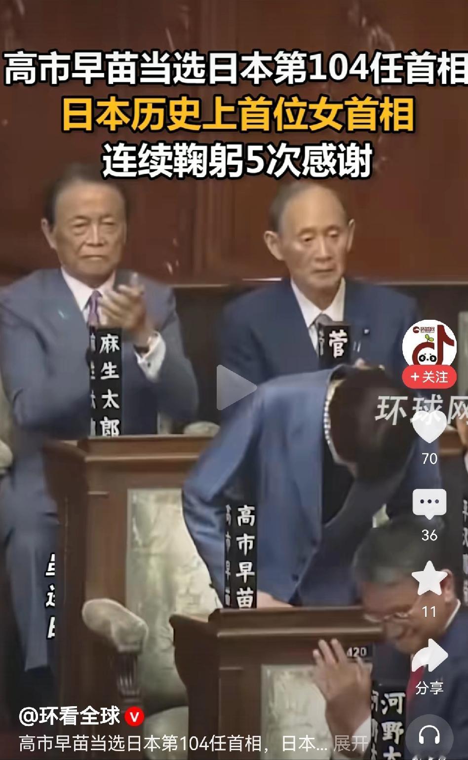 高市早苗的头捣蒜,弯弓腰。背后的两个男人已经麻木了!面无表情,狠劲鼓,送走的首相比当上的还多!看多了男的,有了视觉疲劳,另换个女的玩玩花样!