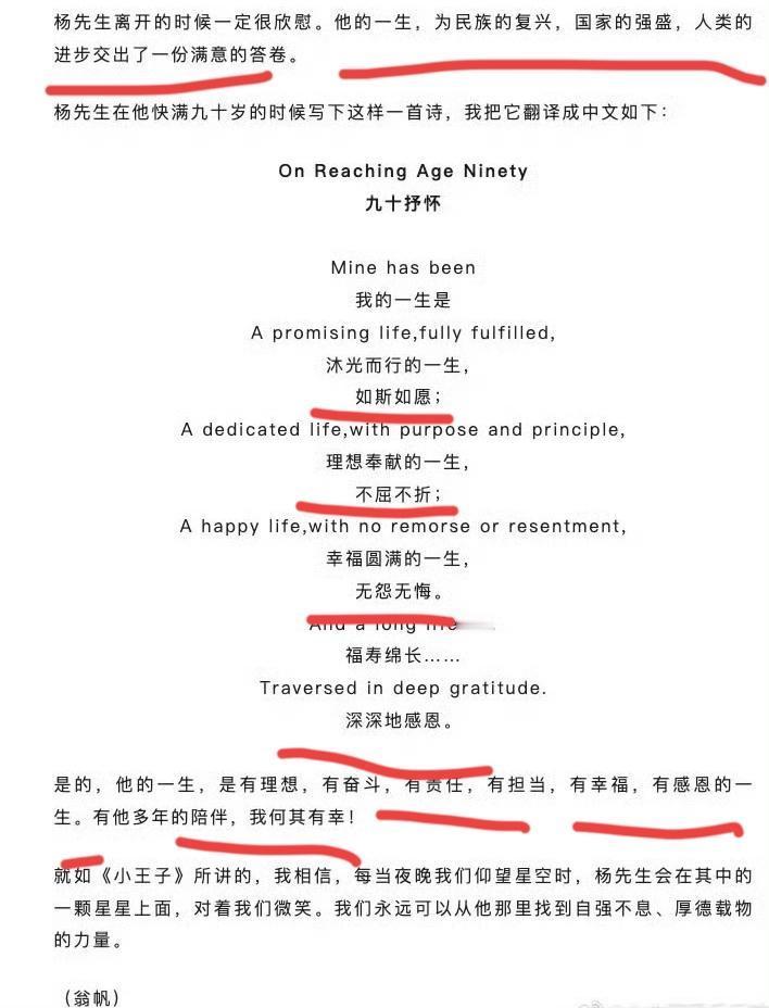翁帆在纪念杨振宁的文字里写下了这么一段话:他的一生,是有理想,有奋斗,有责任,有