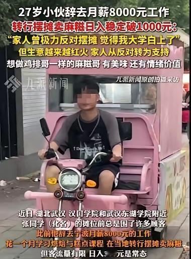 “活该他发财!”武汉这27岁小伙,真把“敢闯”俩字玩明白了!放着月薪8000的稳定工作不干,非要辞职去摆摊卖麻糍,家里人差点跟他急眼,说“读了大学去摆摊,这不白念了?” 可他偏不听,先去学了专业的糕点制作,再把三轮车收拾得干干净净,就这么支起了摊子。刚开始也惨,一天就赚300来块,没气馁反而琢磨:麻糍好看又好吃,年轻人肯定喜欢!转头就把摊子挪到大学城,这下彻底火了,日收入稳稳破1000! 他说做麻糍解压,还想当本地“麻糍哥”,不光卖吃的,还想给顾客带点情绪价值。这哪是瞎闯?分明是有脑子又敢干! 要是你,敢放弃8000的稳定工作去闯一闯吗?你觉得他能做成“麻糍哥”吗?