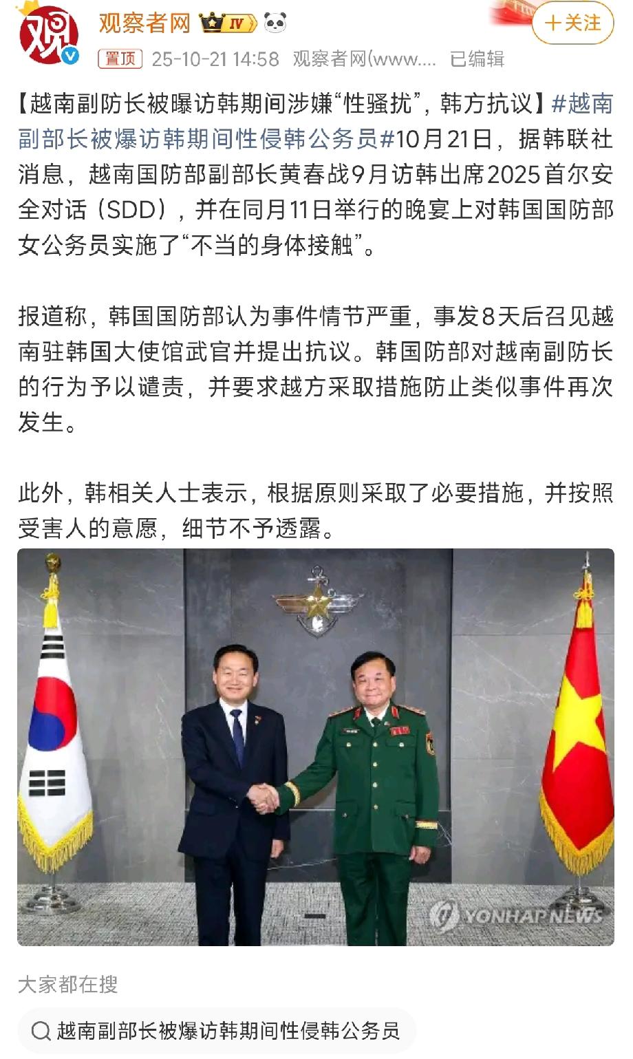 这事儿挺让人意外的,越南国防部副部长黄春战在韩国参加安全对话,闭幕晚宴上被指对一名韩国女公务员有不妥行为。 韩国事后通过外交渠道提了抗议,但细节没公开,越南方面也只说“会注意”,没见后续处理。 其实整件事最让人纳闷的是双方的态度。 韩国强调保护受害者,可拖了八天才交涉;越南呢,副部长回国后照样公开露面,好像没事发生。 有人猜是不是军售利益在里头搅和,但双方官方都没提这茬。 说白了,这种跨国场合的权力不对等,往往让受害者更难发声。 现在信息有限,阴谋论先别急着信,但这件事至少提醒我们:无论身份多高,底线行为不能越界。 希望各方能更透明地解决,别让外交体面压过了对基本尊重的重视。