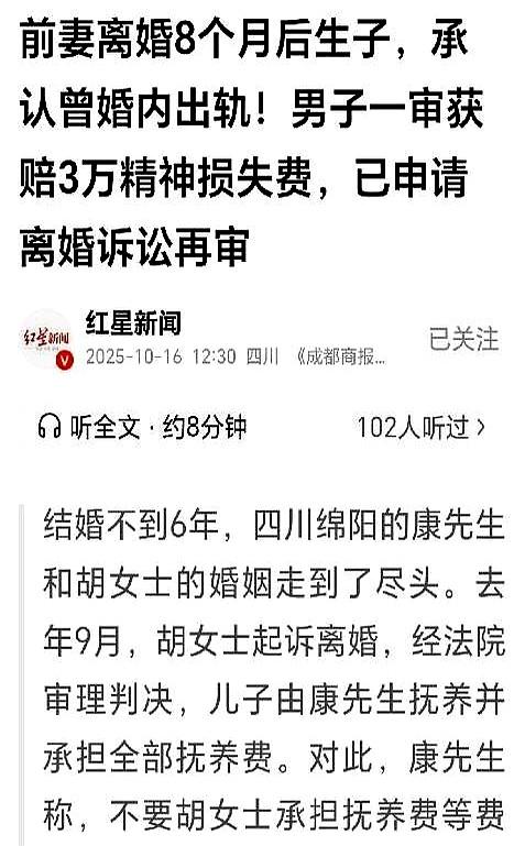成都的杨先生,一张诉状递上法院。 要求前妻黄女士退还1.9万补偿款,再支付儿子从5岁到18岁的抚养费,总计20.8万。 这事儿,得从黄女士离了8个月后,快要生的那个孩子说起。 手指头一算,日子不对。孩子是在他们婚姻存续期怀上的。 当初离婚,女方说他家暴,结果监控调出来,没这回事。 杨先生白天跑滴滴、卖保险,晚上管KTV,还跟前妻合伙开店,连着岳父母一家五口都养着。 他体谅女方,5岁儿子判给自己后,不仅没要抚养费,还倒贴了钱。 他以为这页算翻过去了。 谁知道,前妻肚里的孩子是麻将桌上牌友的,而他过去还常开车送她去茶楼。 起初,他只诉请3万精神赔偿。 没想到女方不服,还上诉。 这下彻底把老实人惹急了,你退一步,她真能踩着你上天。 杨先生直接申请再审,拿着《民法典》第一千零九十一条关于婚姻过错方损害赔偿的规定,把账一笔笔算清楚。 最终法院判了,支持杨先生的全部诉求。 网友都说,这就是教科书级别的维权,对付没底线的人,旧情不能念,这笔账就得这么算,一分都不能少。