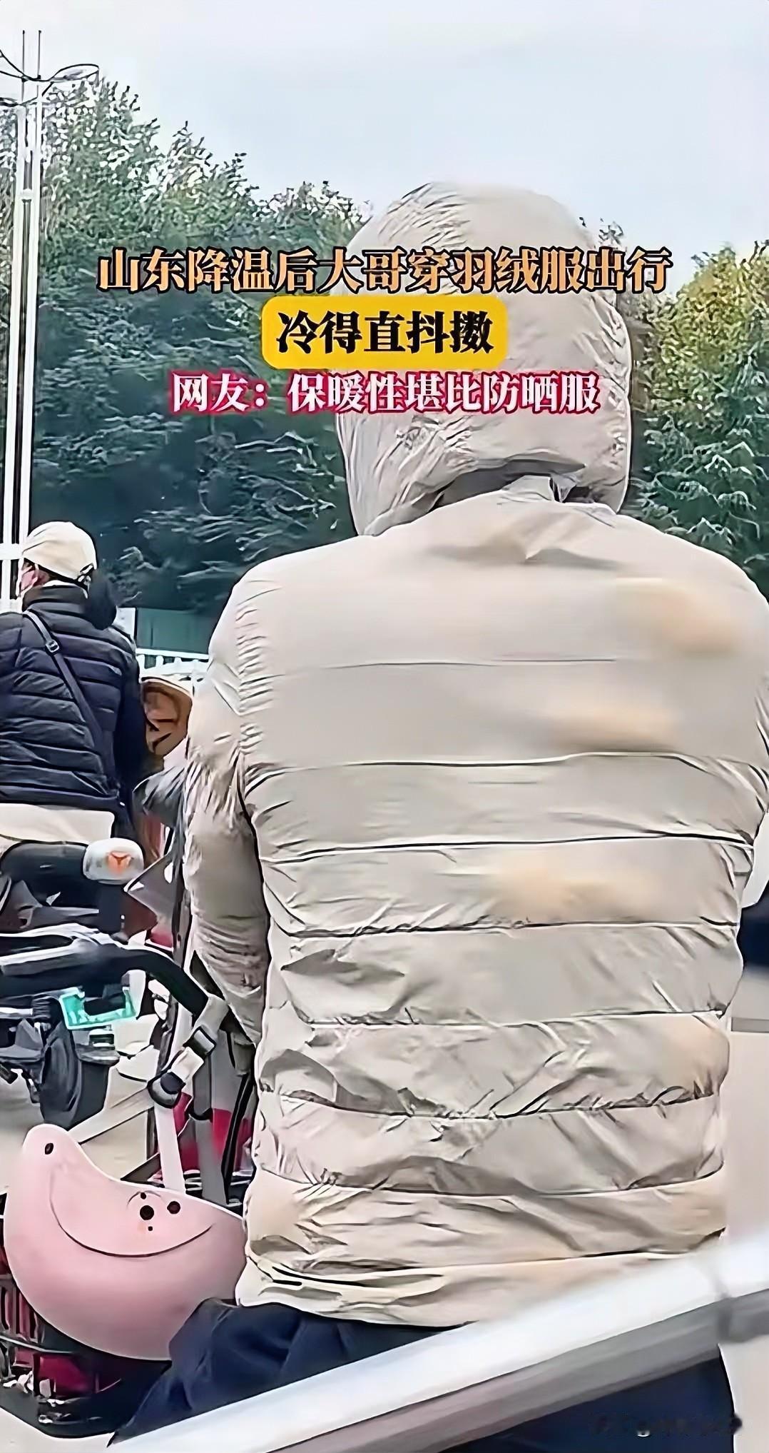 这下全网都看见了👀 山东降温后,有位大哥把羽绒服穿上街,结果冻得直哆嗦。网友一看乐了:“这保暖性,跟防晒服有得一拼!” 仔细瞅这羽绒服,薄薄两层布,里面的羽绒团成一团一团的,跟刚从洗衣机里捞出来没拍蓬松似的。也有人好奇:大哥穿的时候没发现?就不能拍一拍让羽绒散开?难不成是刚洗了没拍开,想靠出门吹风把它“吹蓬松”? 这事儿也给大家提了个醒,买羽绒服可得仔细挑,别花了羽绒服的钱,买了件“防晒羽绒服”回家。要是真碰上这种“假把式”羽绒,天冷出门可太遭罪了!