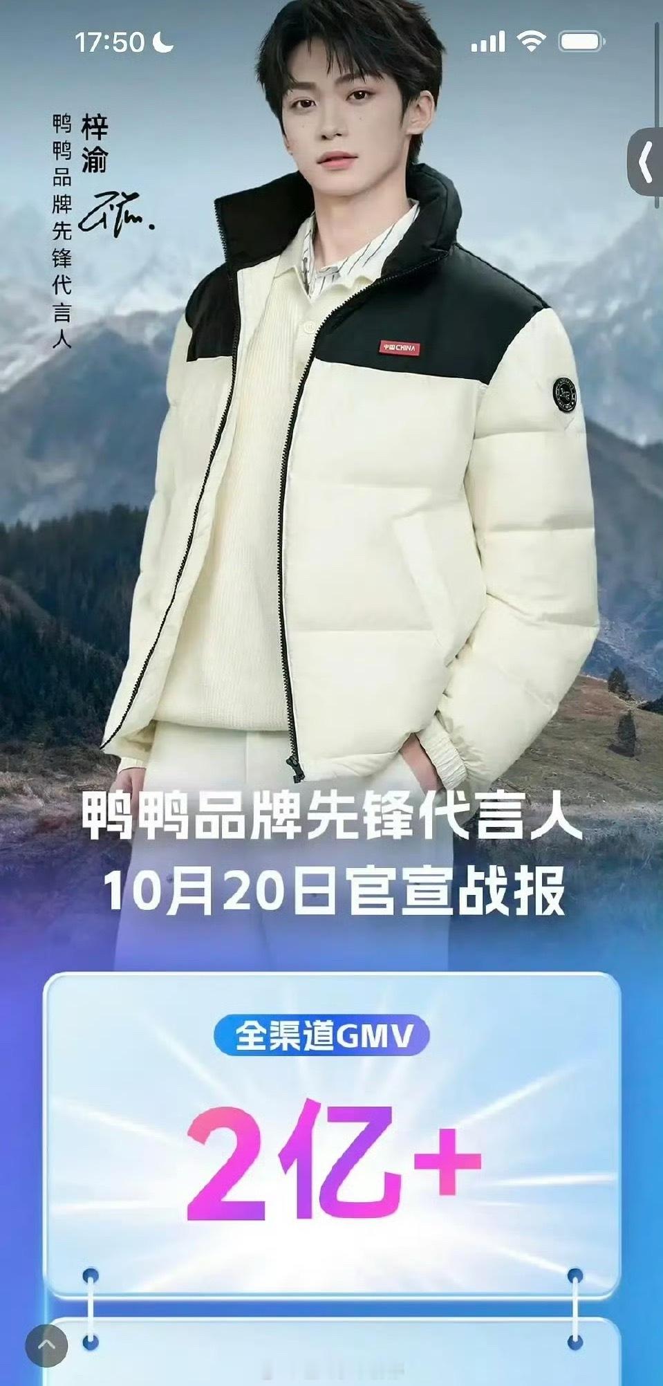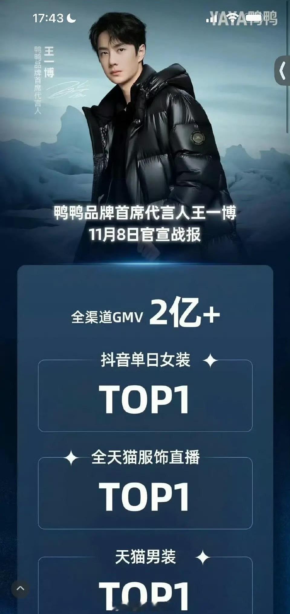 肖战、成毅、王一博、梓渝四位最近当红的男明星都代言过羽绒服哎,销售额都十分可观[