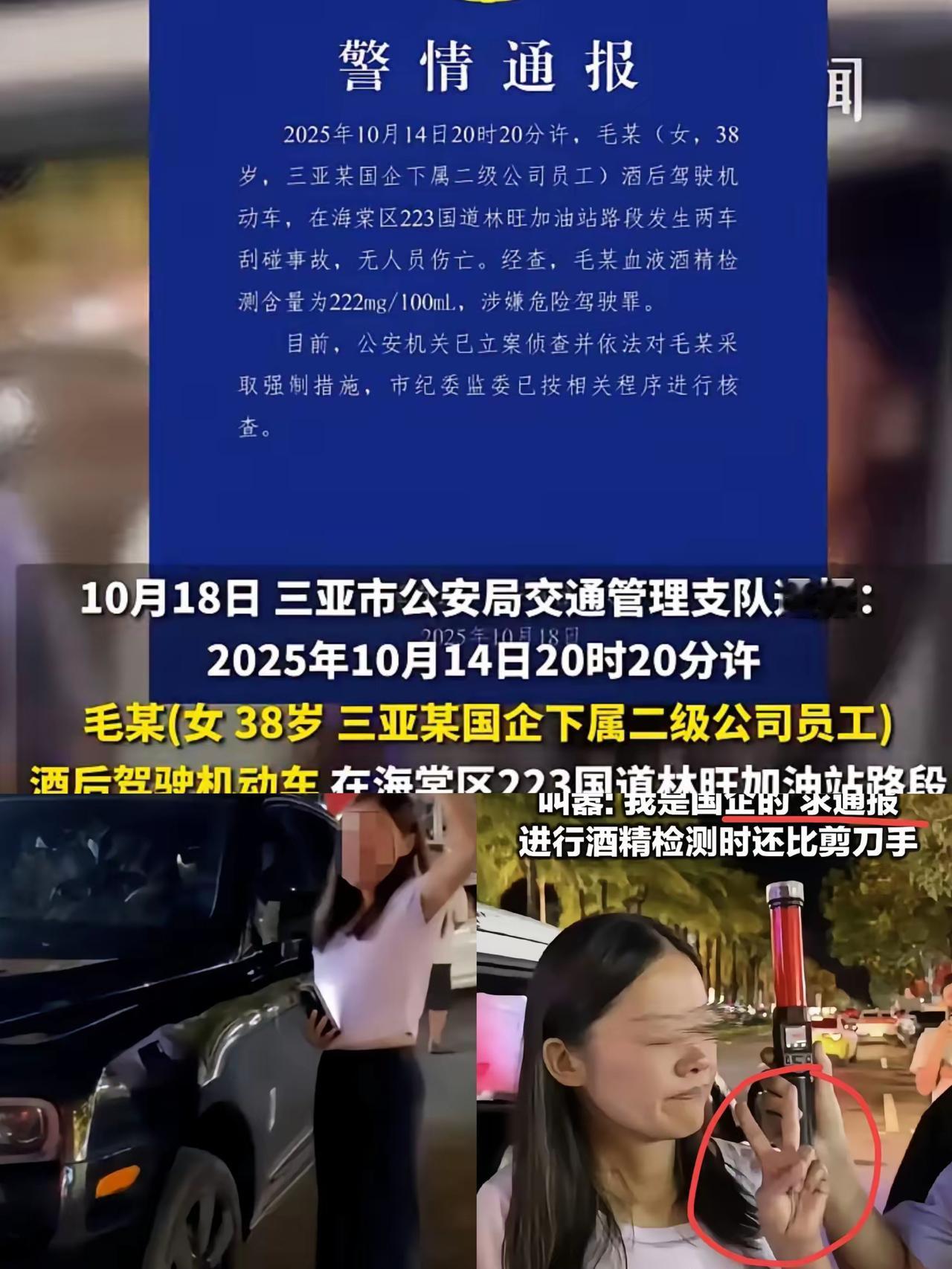 真见过拎不清的,没见过这么作的!三亚那女的酒后倒车撞了劳斯莱斯,车主看她不对劲,主动说给2万私了算了,这简直是天大的台阶。 结果她倒好,不私了不报保险,还对着交警喊“我是国企的”,甚至让市委市政府通报,对着记录仪比剪刀手。她怕是不知道,劳斯莱斯随便蹭下都得几十万维修费,2万纯属车主厚道。 现在好了,血检酒精含量222mg/100mL,涉嫌危险驾驶罪被抓,纪委都介入了,国企工作肯定保不住,还留了案底。真以为“国企身份”是护身符?法律面前,啥身份都不好使。 你们身边见过这种给台阶不下的人吗?评论区聊聊!