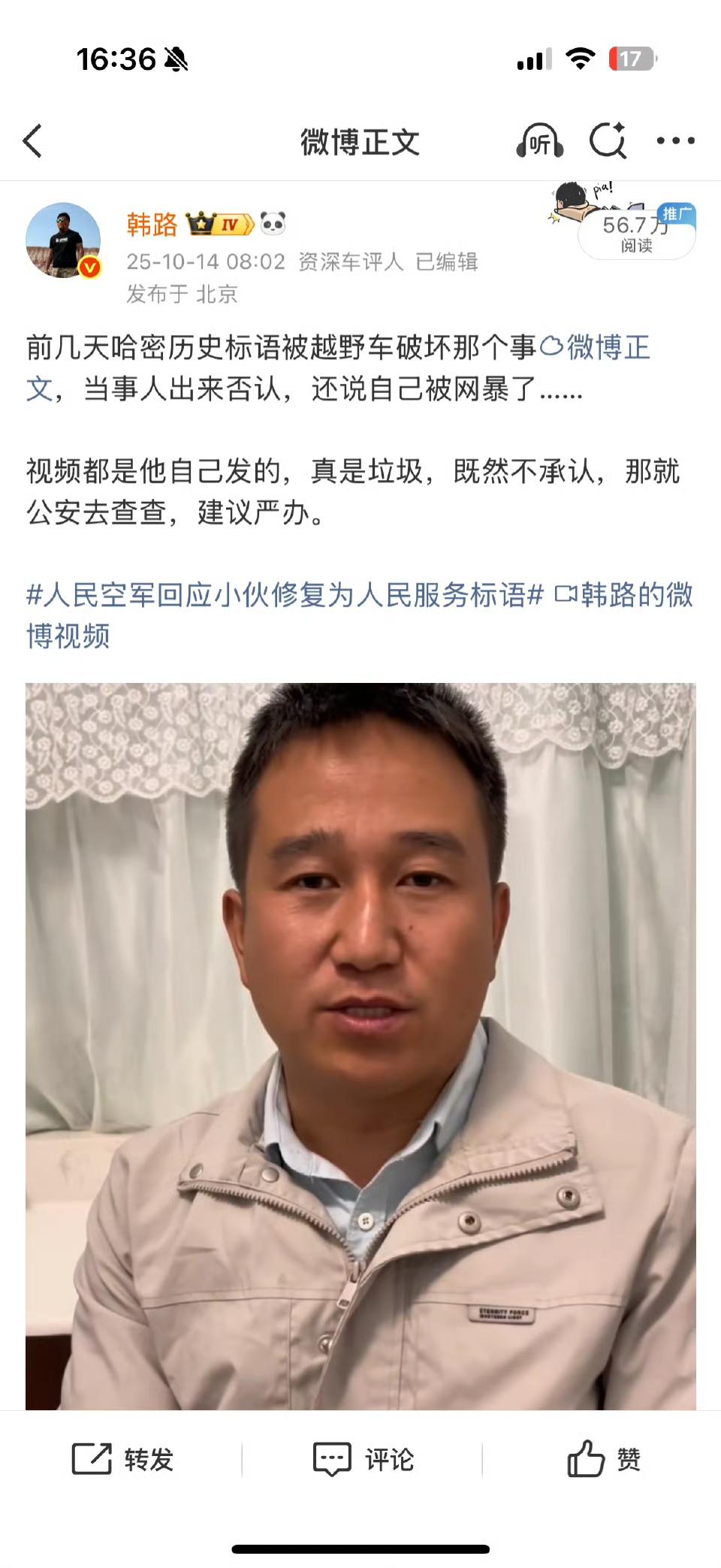 韩路:之前还不承认,说网友网暴他,这下没啥说的了吧! 胡乱漂移破坏历史标语和草场环境,该罚! 影响范围这么大肯定要罚的,开始的时候大家都不知道是谁干的,一位博主自费花钱买了20吨石料去修补之后,大家才慢慢关注是谁去破坏的。 这处在戈壁上的人造标语,更是一段历史的见证,但是有些人却不注重保护,只顾着自己去耍帅。