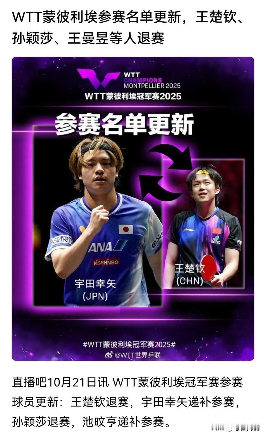 哥姐都退赛了,全力准备全运会!有人是不是瑟瑟发抖了呀[大笑] 退了好,赛事太密集场场参加看着都累! 退了好,退了全网都要祝贺🎉🎉🎉 这下日本队又要豪言壮志夺冠了! 女队的大迪把名次提一提,陈幸同正好亚锦赛也没法,相当于休息了! 蒯曼还年轻,身体能够再一拼! 男队的温瑞博把积分提一提,这样就可以打国际赛事了! 完美[赞][赞][赞] 很多人好奇积分会不会赋零,不管赋不赋零,反正缺积分的不是哥姐, 休息好备战全运会才是最重要的!毕竟前面一直比赛太消耗体力了! 楚钦和莎莎可以好好休息,备战全运会了! 更开心的是宝宝今年也可以在家和爸爸妈妈一起过生日了[蜡烛]