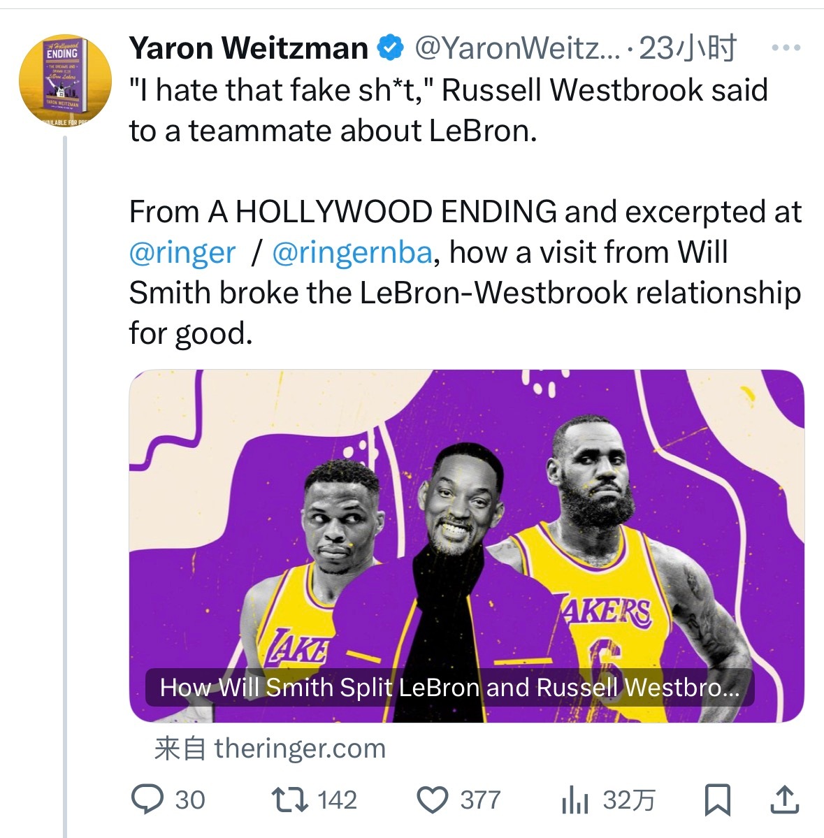 关于记者爆料威少说詹姆斯虚伪这个事儿,我去翻了翻原博,这哥们1w粉丝,博文互动量寥寥。之前说詹姆斯问湖人要合同,后来修正说没要的,也是他。而且,这个新闻在X上几乎没啥声浪,各大知名媒体,都没见发声。最后,按道理来说,NBA更衣室的内容和谈话,都严禁外传,这记者说的跟在现场似的,真的很难让人信服。这家伙也是老詹黑了,当篇笑话看的了。从布朗尼的为人处事,就可以看出来詹姆斯的为人处事是什么样的。