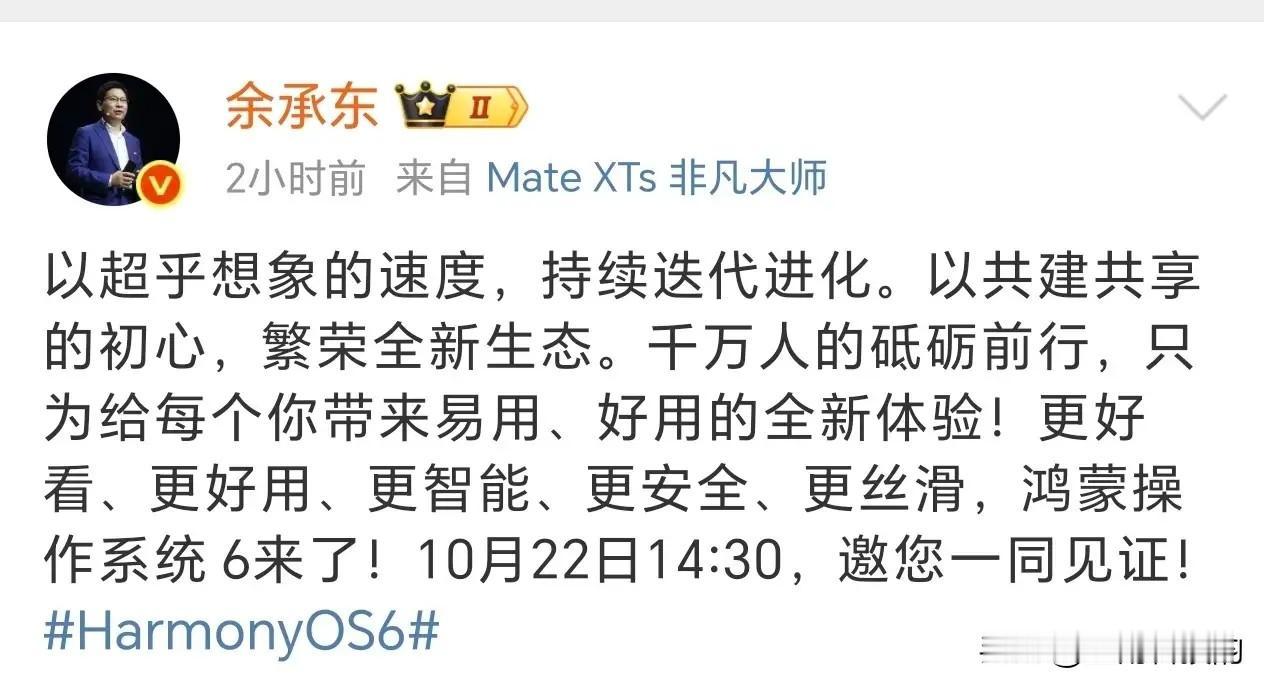 好家伙!余承东说华为鸿蒙6明天下午就要来了! 华为这是搞系统界的“双十一”呢,