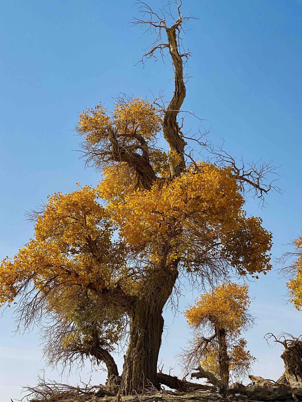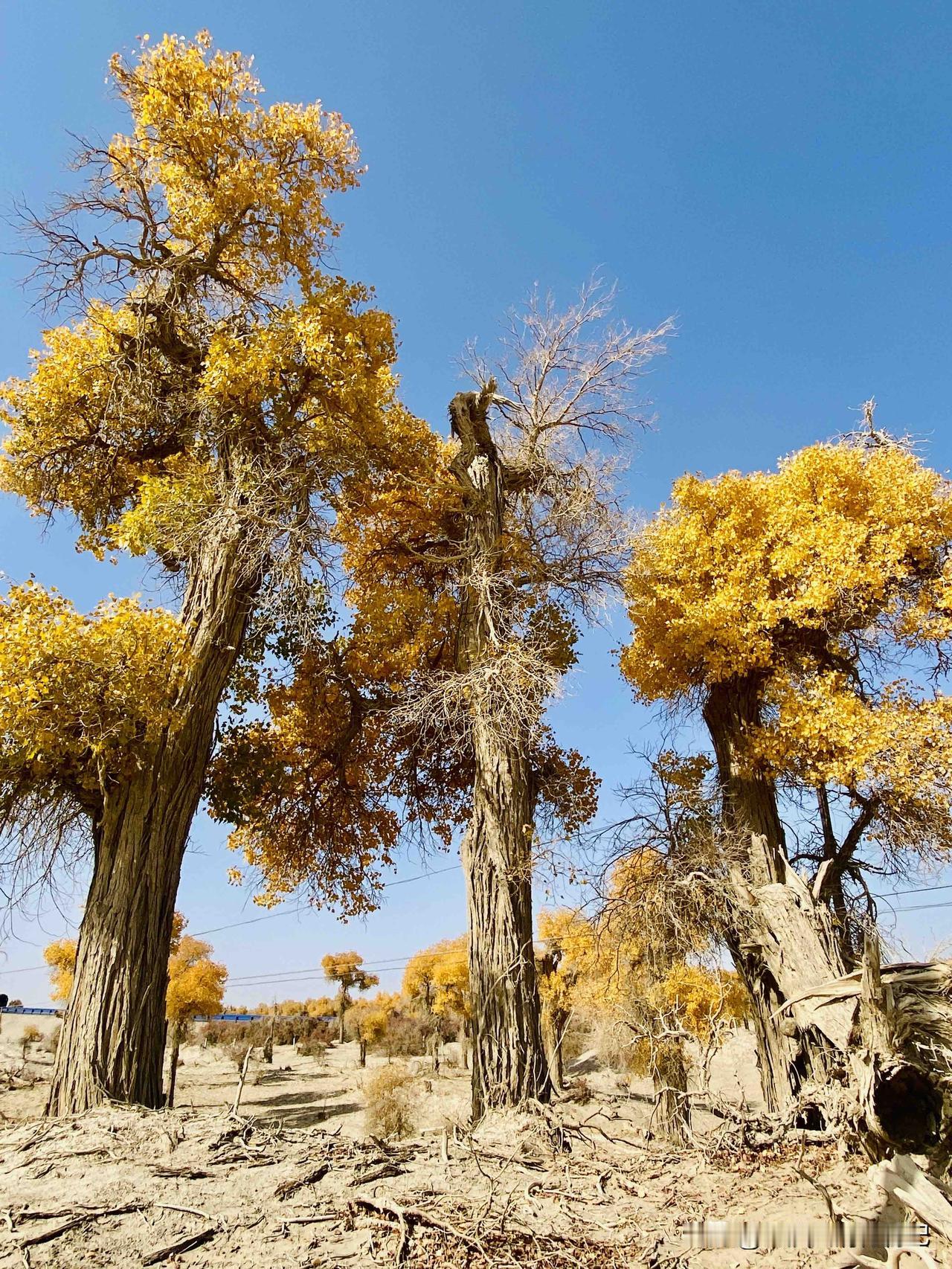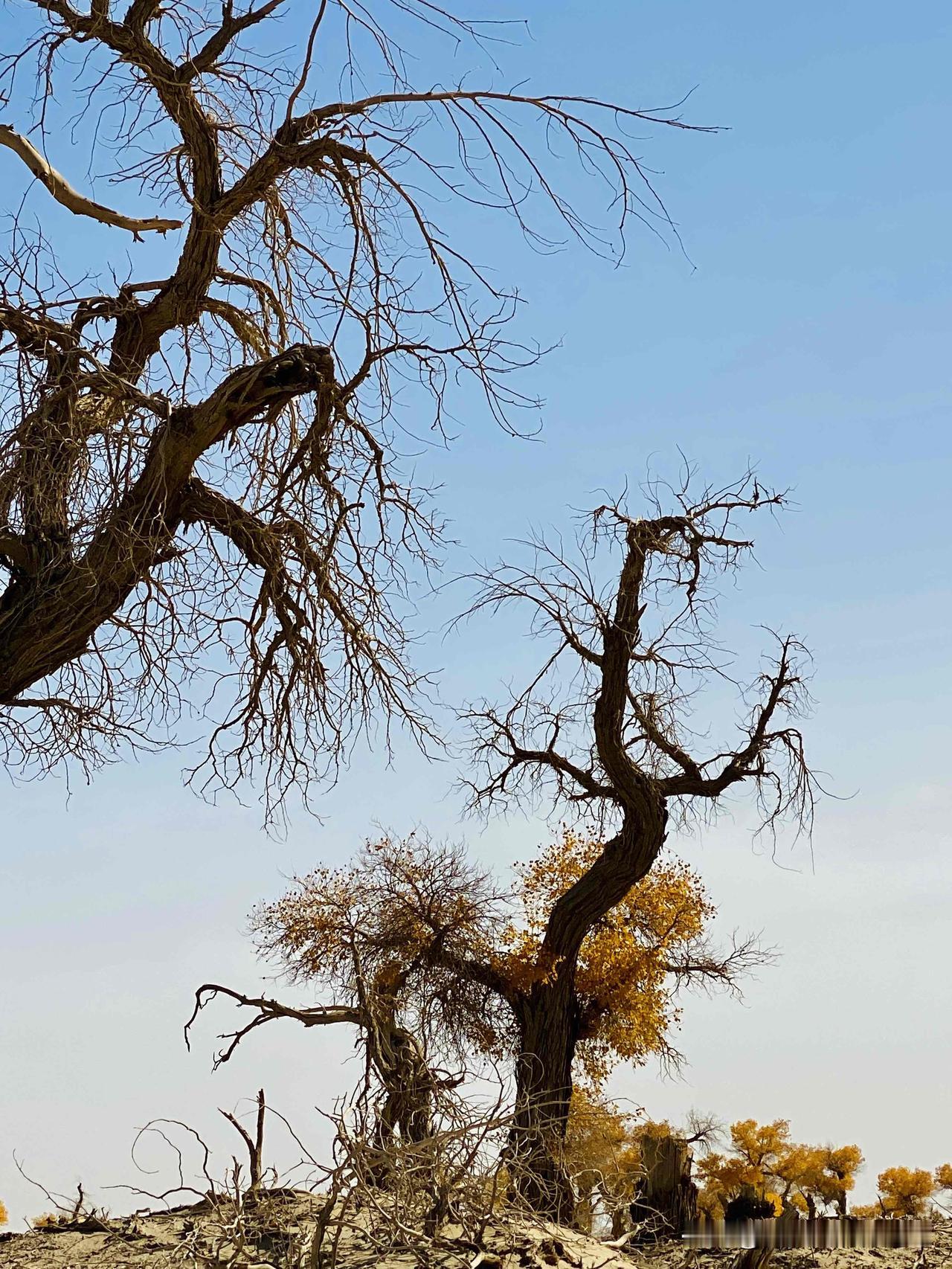 胡杨是世界上最古老的树种之一,已经在我们这个星球生存了1.3亿年。 生存于荒漠戈壁中的胡杨,它们有着三千年的坚韧生命,生而千年不死,死而千年不倒,倒而千年不腐,可谓生命不止生生不息生死相依! 这一组图片,随拍于尉犁县至若羌县G218国道旁的一处荒漠中,它们那些或倒伏的躯干、或遒劲的身姿、或焕发的生机,给予我强烈的灵魂震撼和视觉冲击,令我一时无法用言语形容心中的感触! 胡杨风景 金色的胡杨树 胡杨旅游季 秋日胡杨 胡杨奇观 胡杨