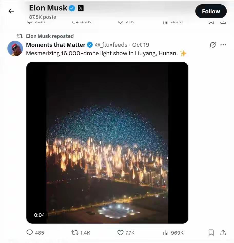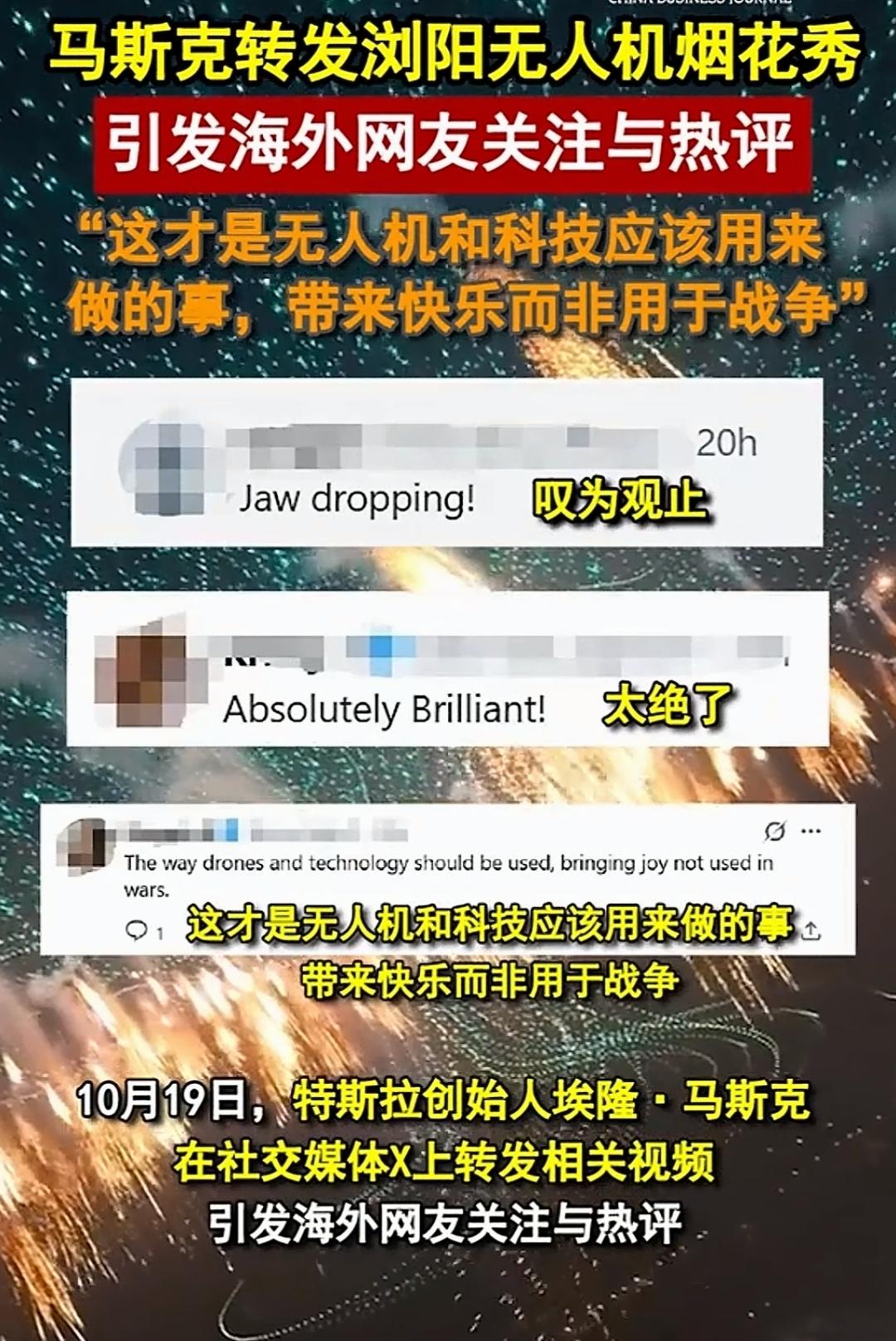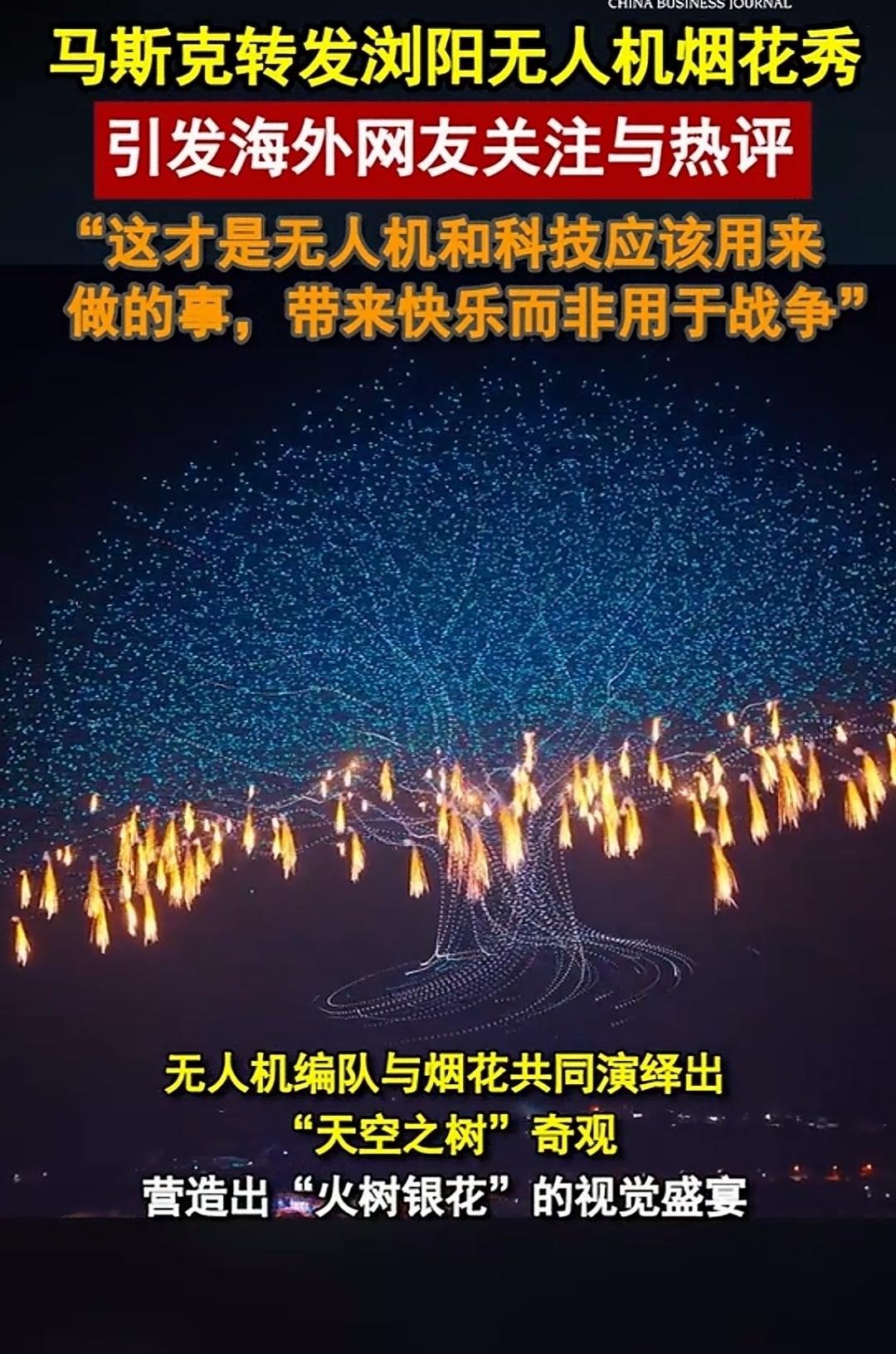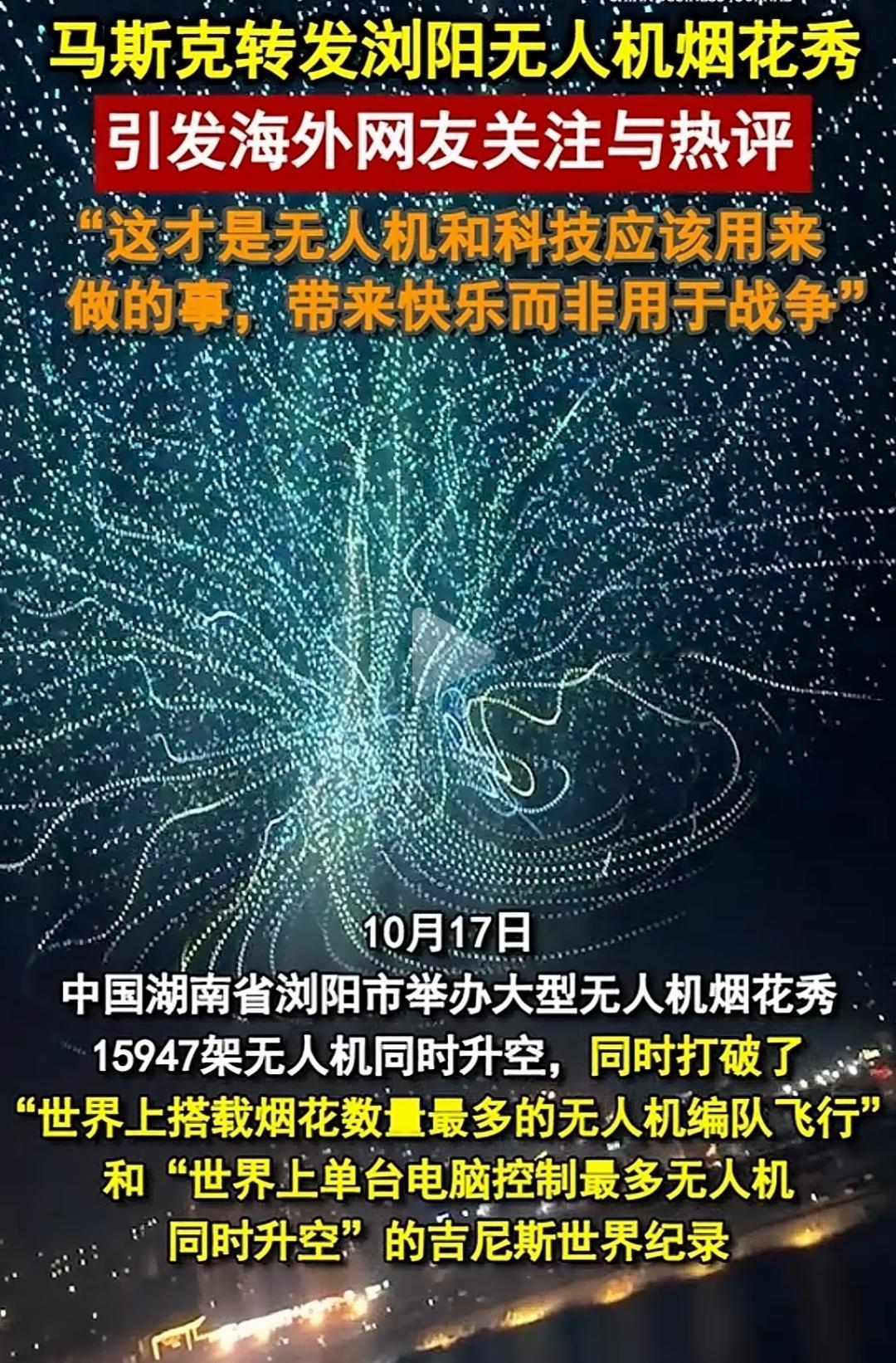 马斯克居然也被洗成自干五和小粉红了[笑哭][笑哭][笑哭]因为他经常转发中国科技新闻,免费利用自己的影响力帮助中国进行形象宣传。 刚刚他又点赞转发了中国浏阳15947架无人机与7496支烟花协同表演,这场表演刷新“单台电脑控制最多无人机升空”和“搭载烟花最多无人机编队”两项吉尼斯世界纪录。 我们中华文明就是这样善良,古代有了火药,首先想到的是做烟花为我们带来快乐。现在有了无人机,首先想到的是也是做灯光秀为我们带来快乐。 如果把这样的集群无人机带入到俄乌战场,会是什么样的一个情形,可想而知。 西方那些人是怎么好意思认为我们在军事援助俄罗斯的呢? 点右上角关注我,我们一起去看这个魔幻的世界