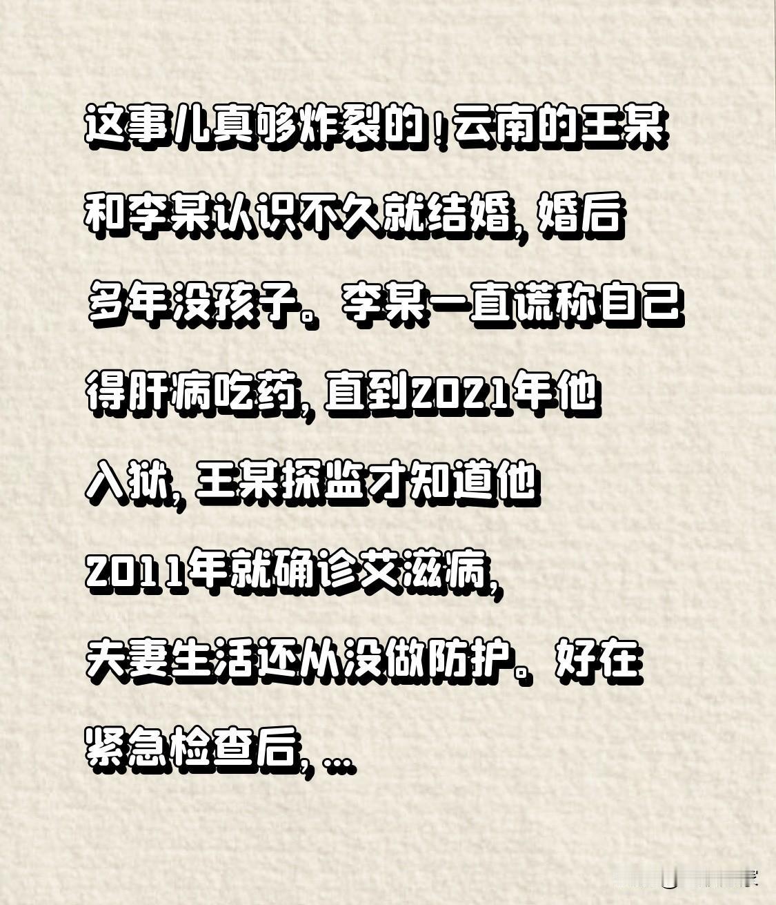 这事儿真够炸裂的!云南的王某和李某认识不久就结婚,婚后多年没孩子。李某一直谎称自己得肝病吃药,直到2021年他入狱,王某探监才知道他2011年就确诊艾滋病,夫妻生活还从没做防护。好在紧急检查后,王某没被感染。李某说自己积极治疗没传染性,但这能抵消他的隐瞒之罪吗? 王某一怒之下把李某告上法院,法院判决撤销婚姻。《民法典》明确有重大疾病婚前得告知,不告知无过错方有权撤销。这判决给了王某一个公道。 大家说说,这婚姻里的隐瞒到底有多可怕?要是王某被感染了该咋办?遇到这种隐瞒重大疾病的情况,大家觉得还有啥更好的解决办法? 艾滋病感染者 艾滋病婚检 艾滋病恐惧症 艾滋病防治宣传 农村艾滋病问题 外国艾滋病 艾滋病抗艾 艾滋病初筛检测 愿众生平安吉祥 南无阿弥陀佛🙏🙏🙏 愿众生平安吉祥 南无观世音菩萨