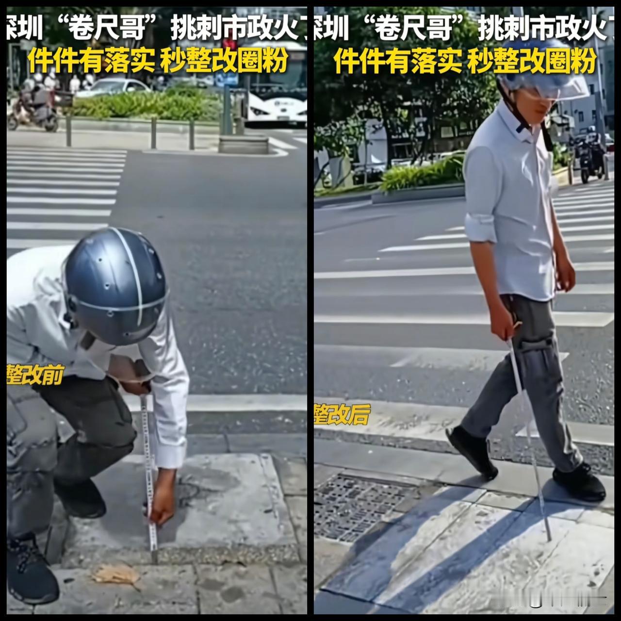 一个拿着卷尺整天给市政找问题的“卷尺哥”火了,可我觉得更应该火的是应该是虚心接受市民意见建议,能够雷厉风行把问题及时解决掉的深圳市政府的工作作风。 “卷尺哥”给深圳市找得这些问题,看似都是鸡毛蒜皮,无非就是人行天桥台阶太陡、人行道不平整、指示牌高度过低等等这些问题。这些问题不仅深圳存在,几乎各个城市都或多或少存在。可最大的区别在于其他城市在面对市民的投诉和问题反馈时,是不是能够做到迅速行动,做到让市民满意,及时把问题整改到位呢? 而深圳市却做到及时整改,让市民满意。虽然身处内地,感受不到经济特区的服务高标准,但从“卷尺哥”的火,看出了深圳市公务人员的服务意识,这样的城市才值得青年人为之奔赴而来,其他城市也应该从中学会服务市民的精髓,不是口号而是真真正正的无声行动。