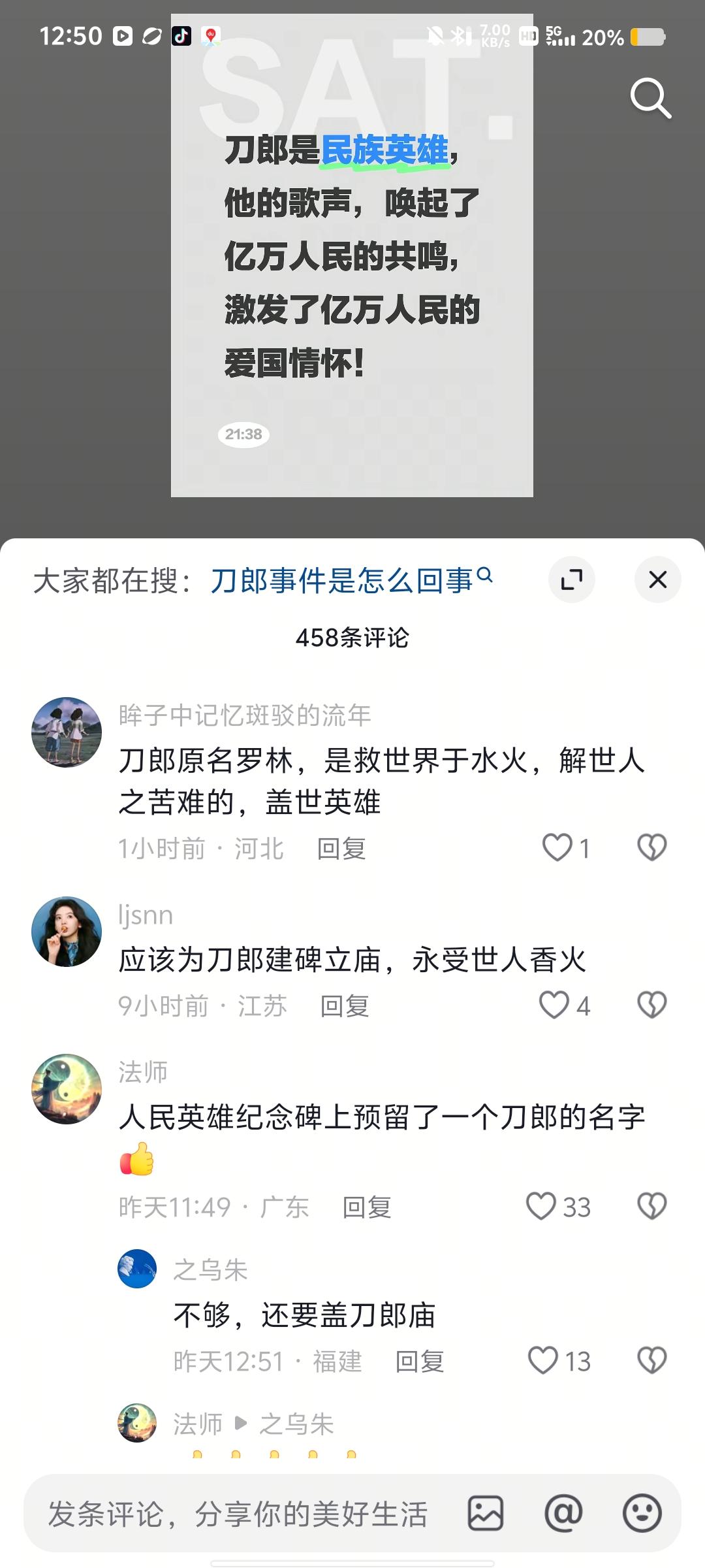 伟大的刀郎先生,哈哈哈 刀郎先生堪称民族英雄,他唤起了亿万人民的共鸣,激发了大众的爱国情怀。 评论区: 评论一:刀郎原名罗林,是拯救世界于水火、解救世人于苦难的盖世英雄。 评论二:应当为刀郎建碑立庙,让他永受世人香火供奉。 评论三:某某纪念碑上应添上刀郎的名字。 这是我在抖音上看到的内容。 刀郎一出,天下无敌。 什么罗大佑、李宗盛、许冠杰、谭咏麟、张国荣、四大天王、“周结巴”、王力宏、谢霆锋,都得靠边站。 刀郎是伟大的音乐巨匠、艺术大家、文学泰斗、哲学宗师,堪比李白、杜甫。 刀郎一出,天下谁与争锋! 刀郎 刀郎新疆 刀郎旅游