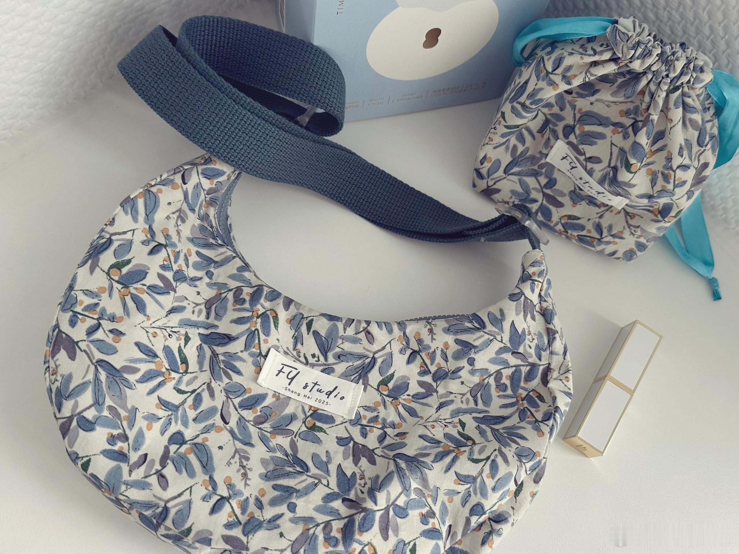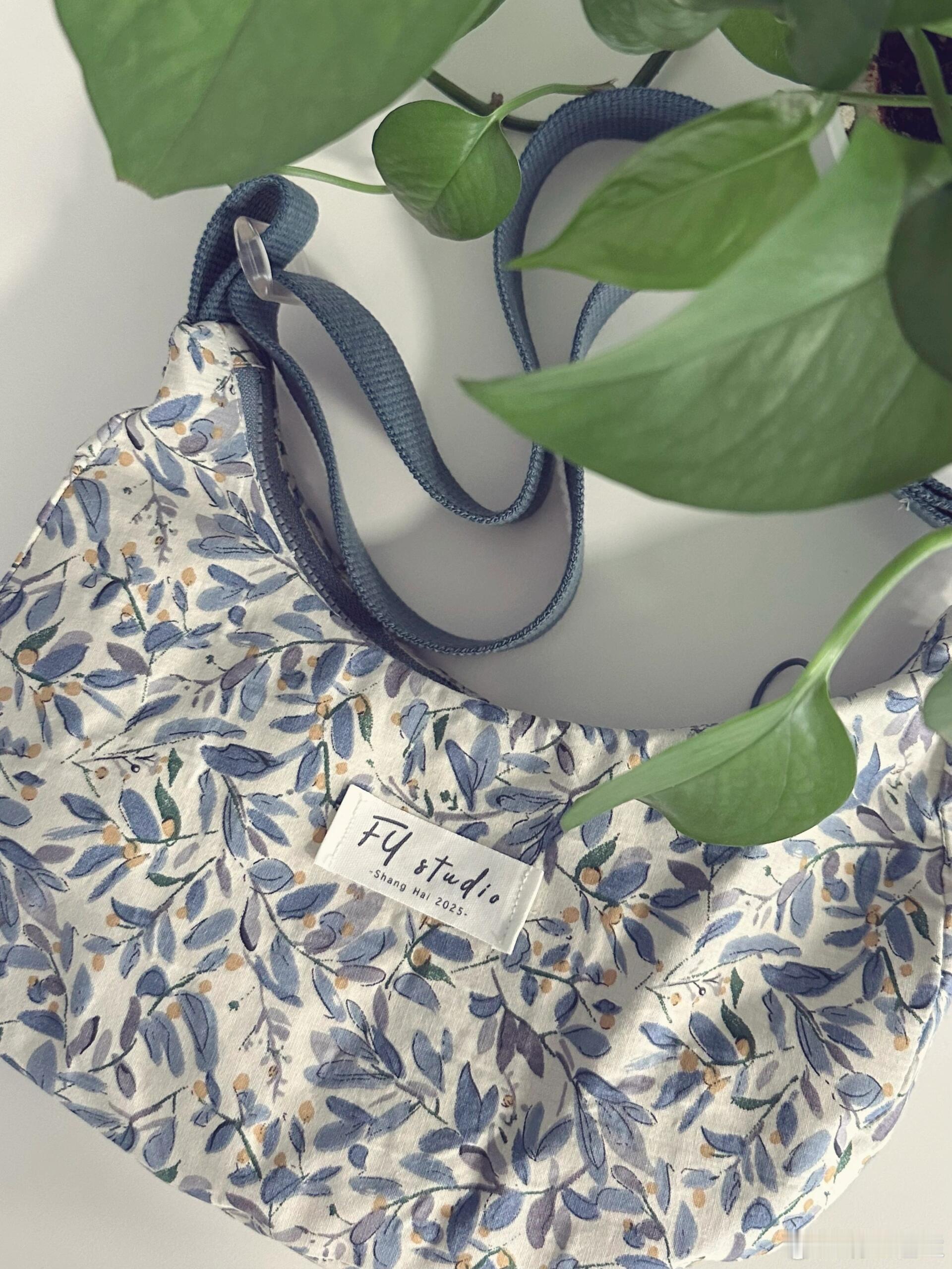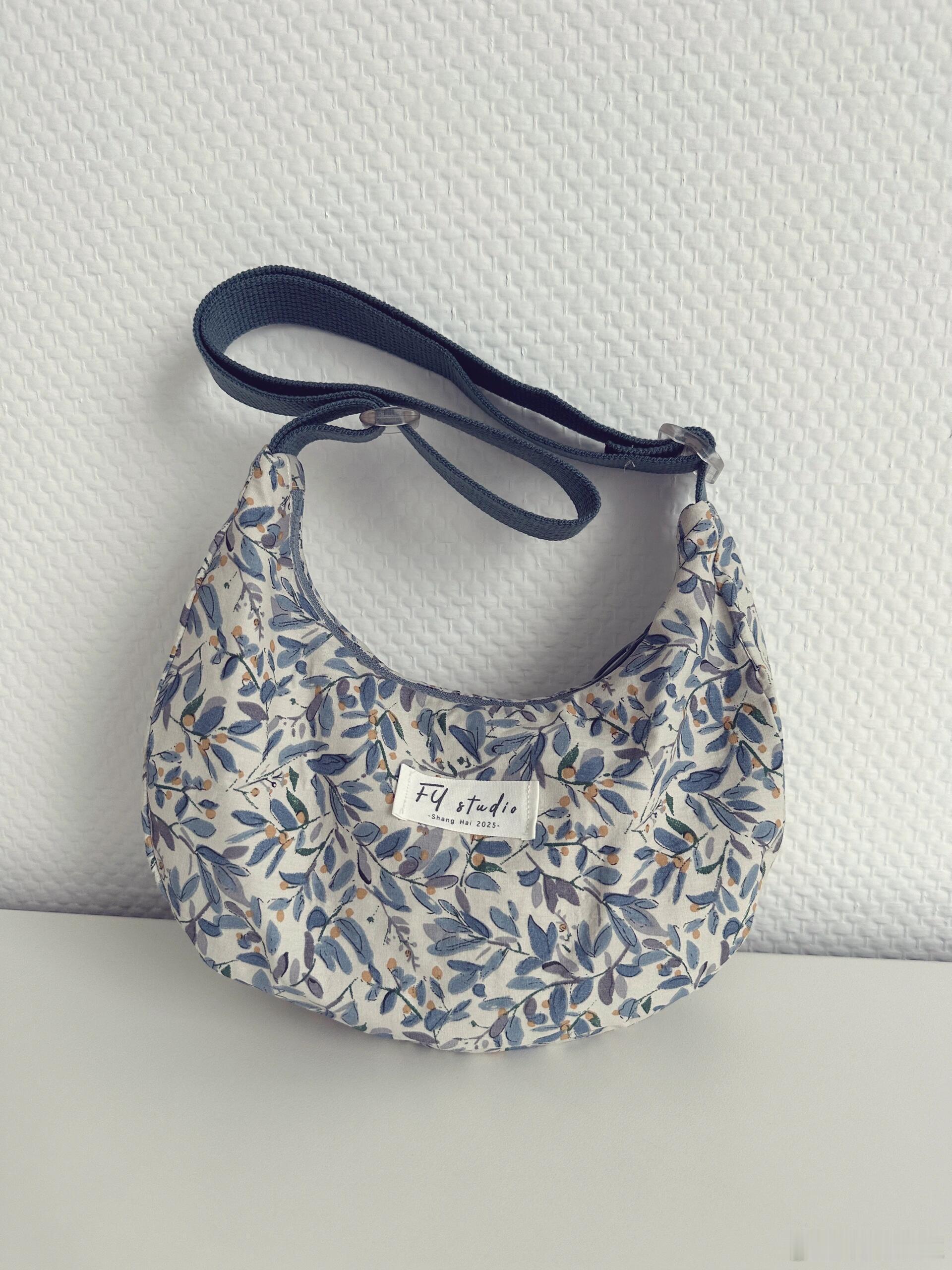 这款来自FY studio的月牙形布艺手袋,以米白色为底,饰以蓝灰色抽象枝叶印花与橘色细节点缀,整体散发清新文艺气息。藏青色尼龙宽肩带搭配银色调节扣,兼顾实用与美观。包身正面缝有品牌白色标签,"Shang Hai 2023"字样彰显都市时尚基因。圆润的饺子包型搭配立体剪裁,兼具柔美与收纳功能。在粗粝白墙背景下,柔和光线凸显出面料质感与简约设计,完美诠释了现代都市与自然美学相融合的日常配饰理念。时尚配饰