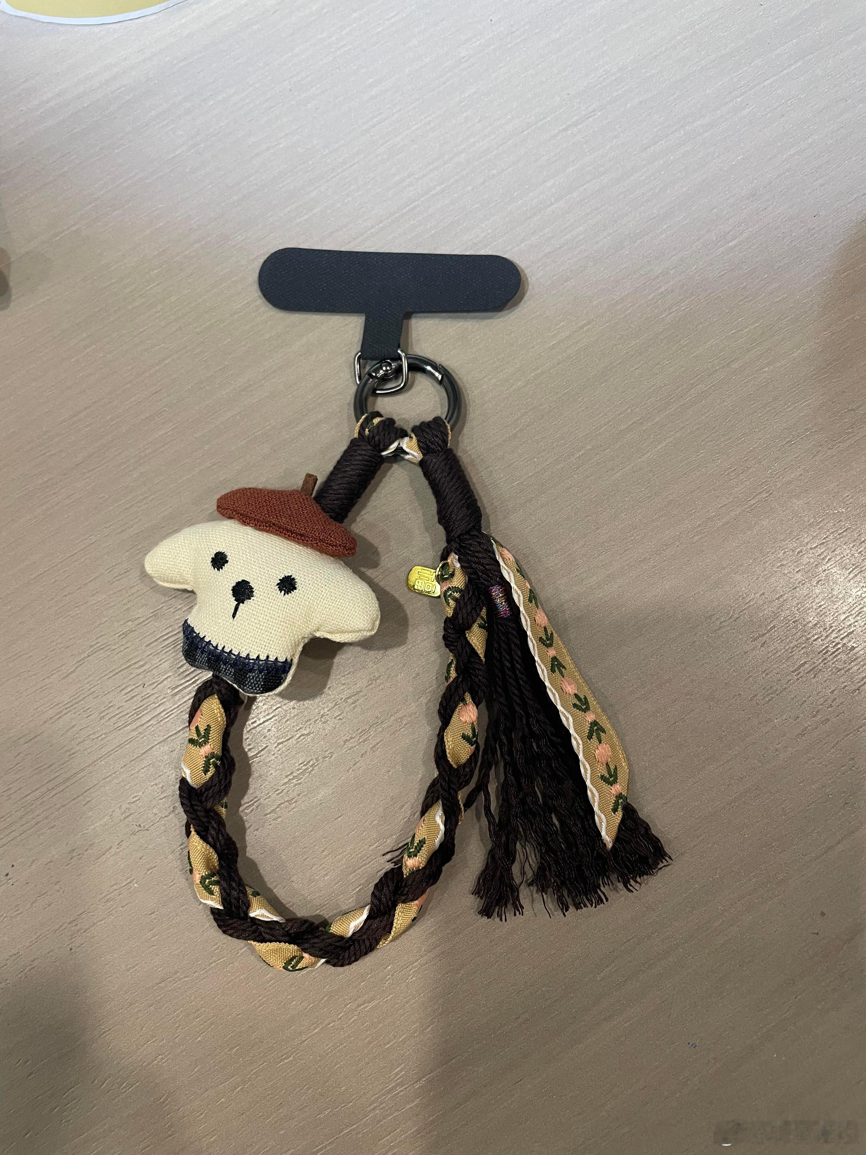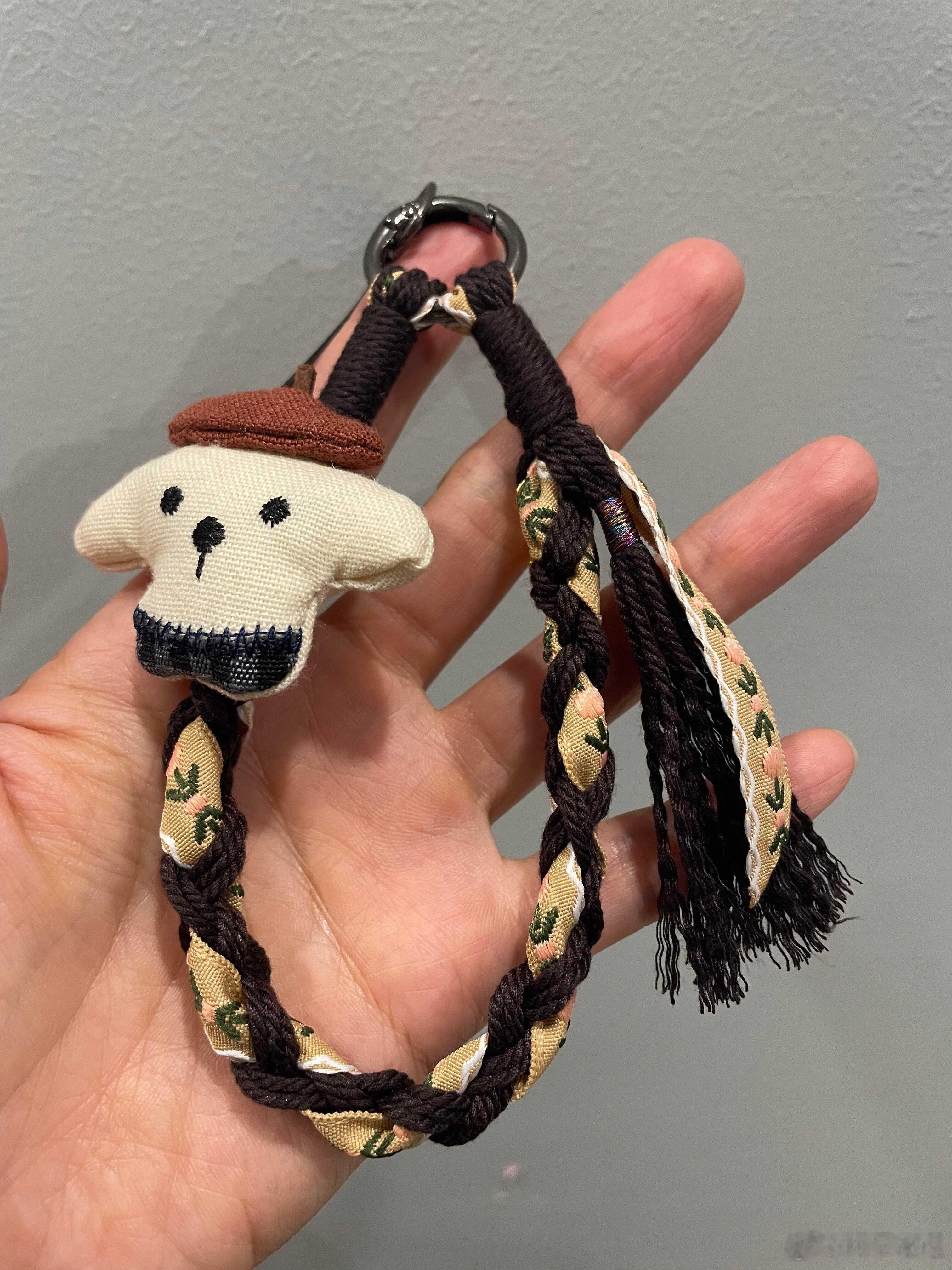 这款白色小狗造型的布艺挂饰,头戴棕色贝雷帽,颈系深蓝格纹围巾,憨萌表情尽显可爱。挂绳由深棕棉线与点缀着小花绿叶的织带编织而成,下方垂落着黑色流苏与小巧金色吊牌,顶部配有实用的T型夹扣。整体设计融合了手作温度与文艺细节,既可悬挂于背包、手机,也能作为钥匙扣使用,在浅灰背景的映衬下,为日常小物增添一抹温暖治愈的陪伴感。时尚配饰