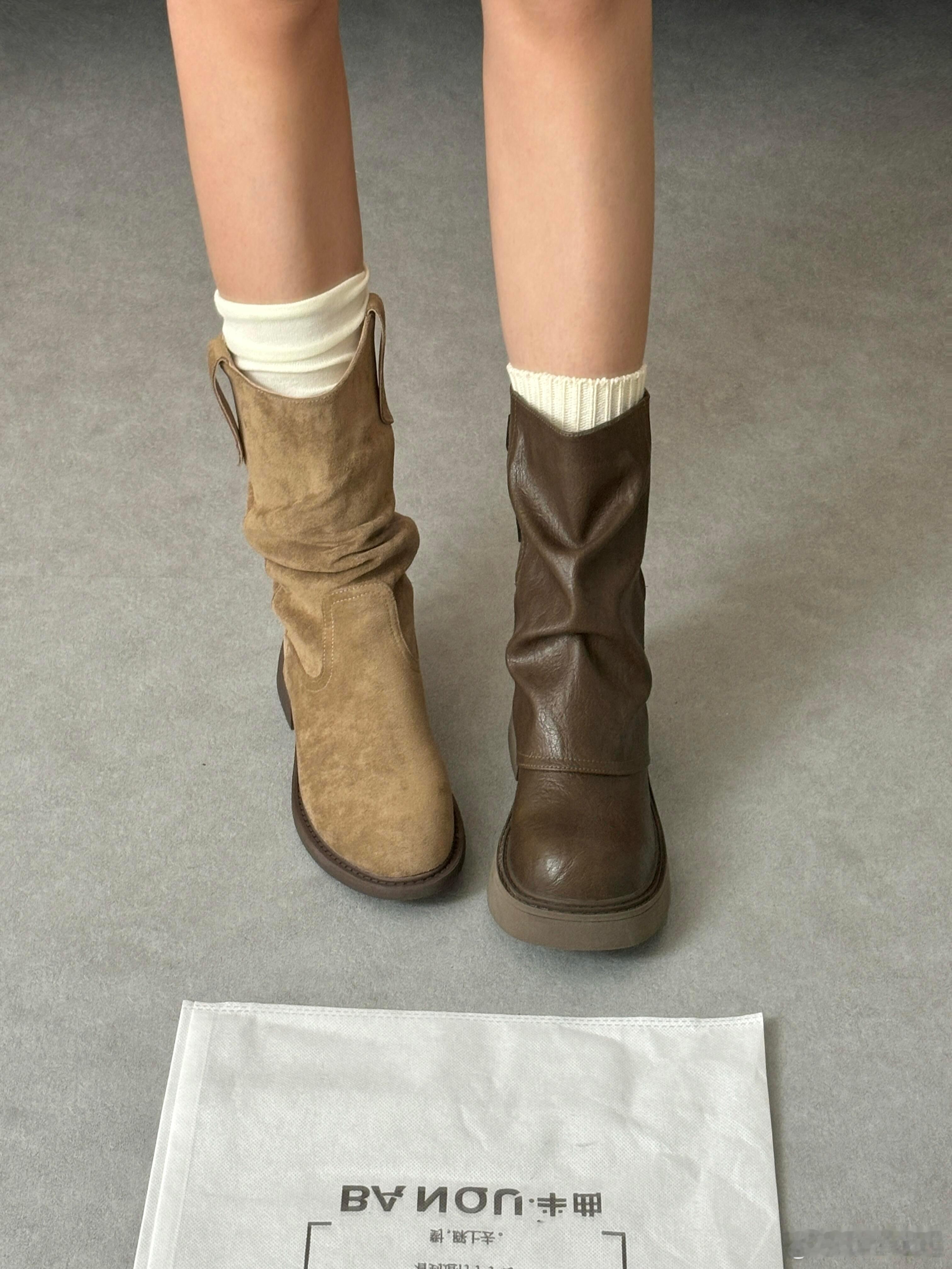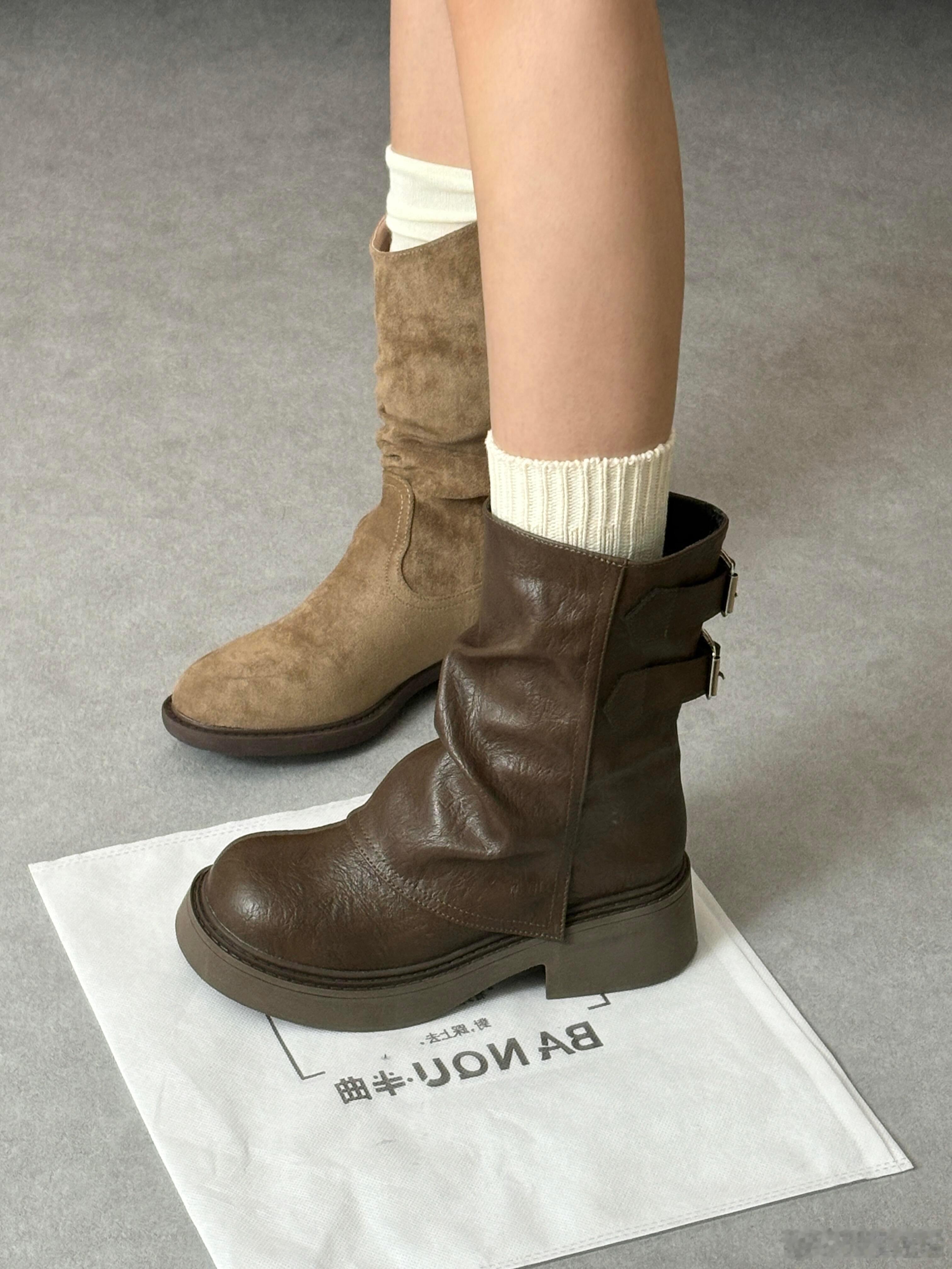 这款设计简约的卡其色中筒靴,采用富有质感的磨砂皮打造,自然的褶皱尽显随性休闲风格。其标志性设计在于脚踝处独特的翻盖与搭扣装饰,不仅增添了机能美感,也便于穿脱。鞋子搭配了白色的罗纹针织袜套,进一步强化了舒适与时尚相结合的调性。整体轮廓利落,中性百搭,无论是搭配牛仔裤还是休闲裤都能轻松驾驭,完美契合日常出行的都市格调,低调中透出不凡品味。时尚鞋履