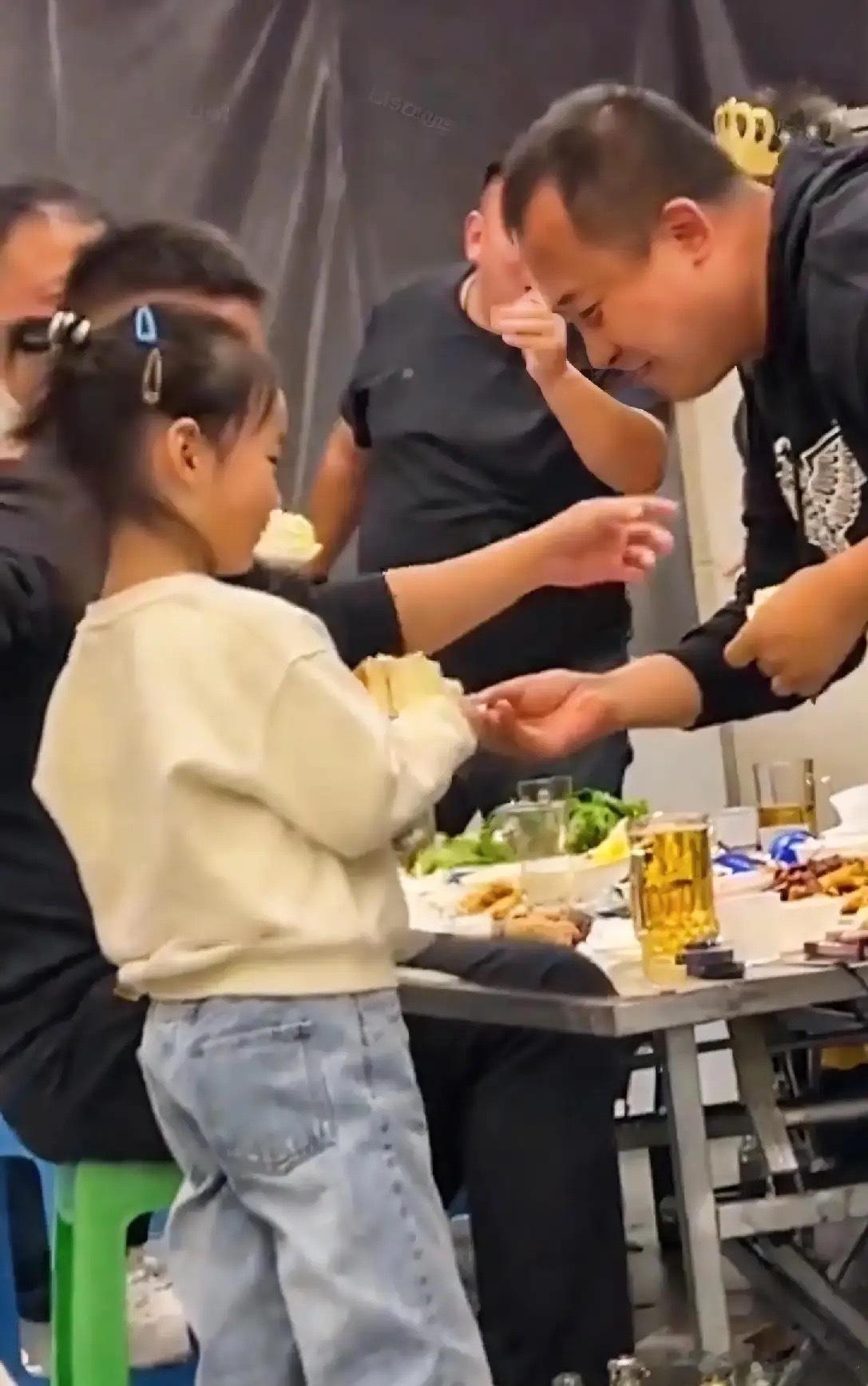 一边满脸笑意地纷纷给孩子鼓掌,一边赶紧切了一大块蛋糕递给孩子,同时感谢孩子的祝福。