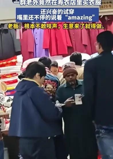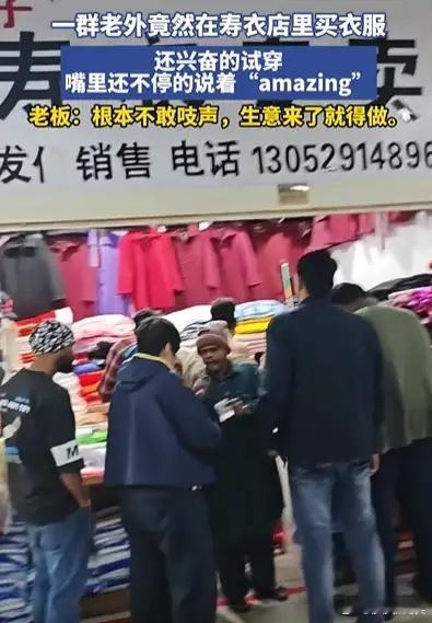 视频中,五个高鼻梁老外,背着鼓囊囊的双肩包,举着手机东瞅西瞅。女子以为是来问路的——常有外地游客找过来,结果,几人在店里挑选起寿衣,嘴里“beautiful、beautiful”地念叨,女子没当回事:游客好奇看两眼很正常,顶多拍张照就走。