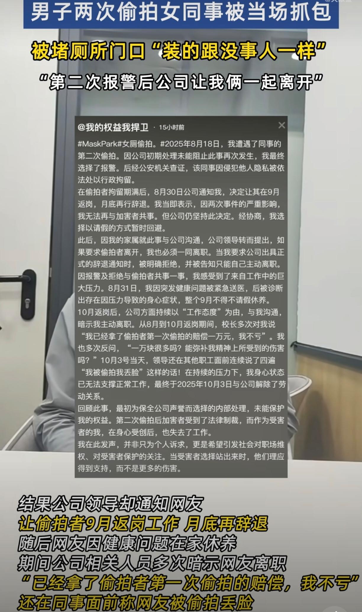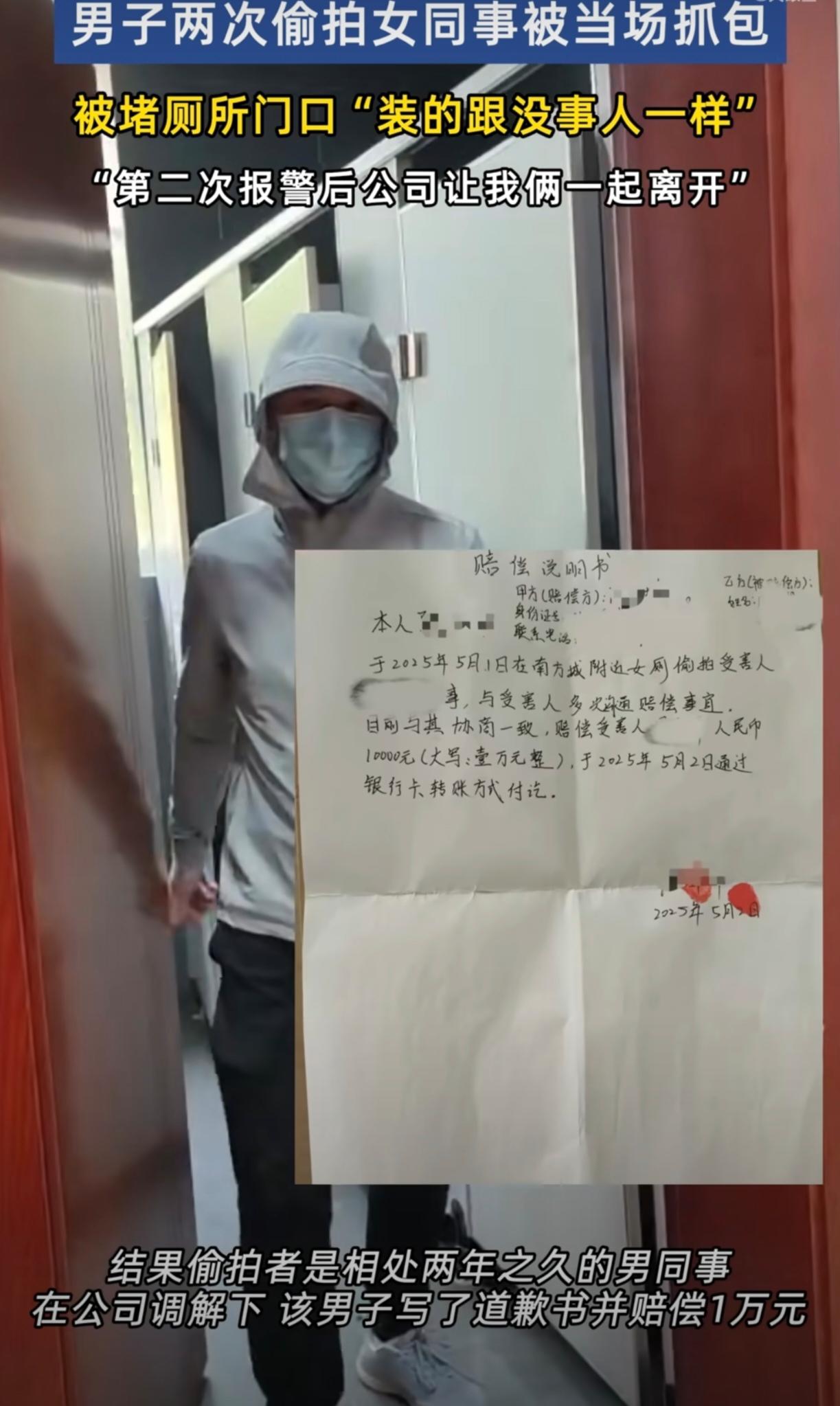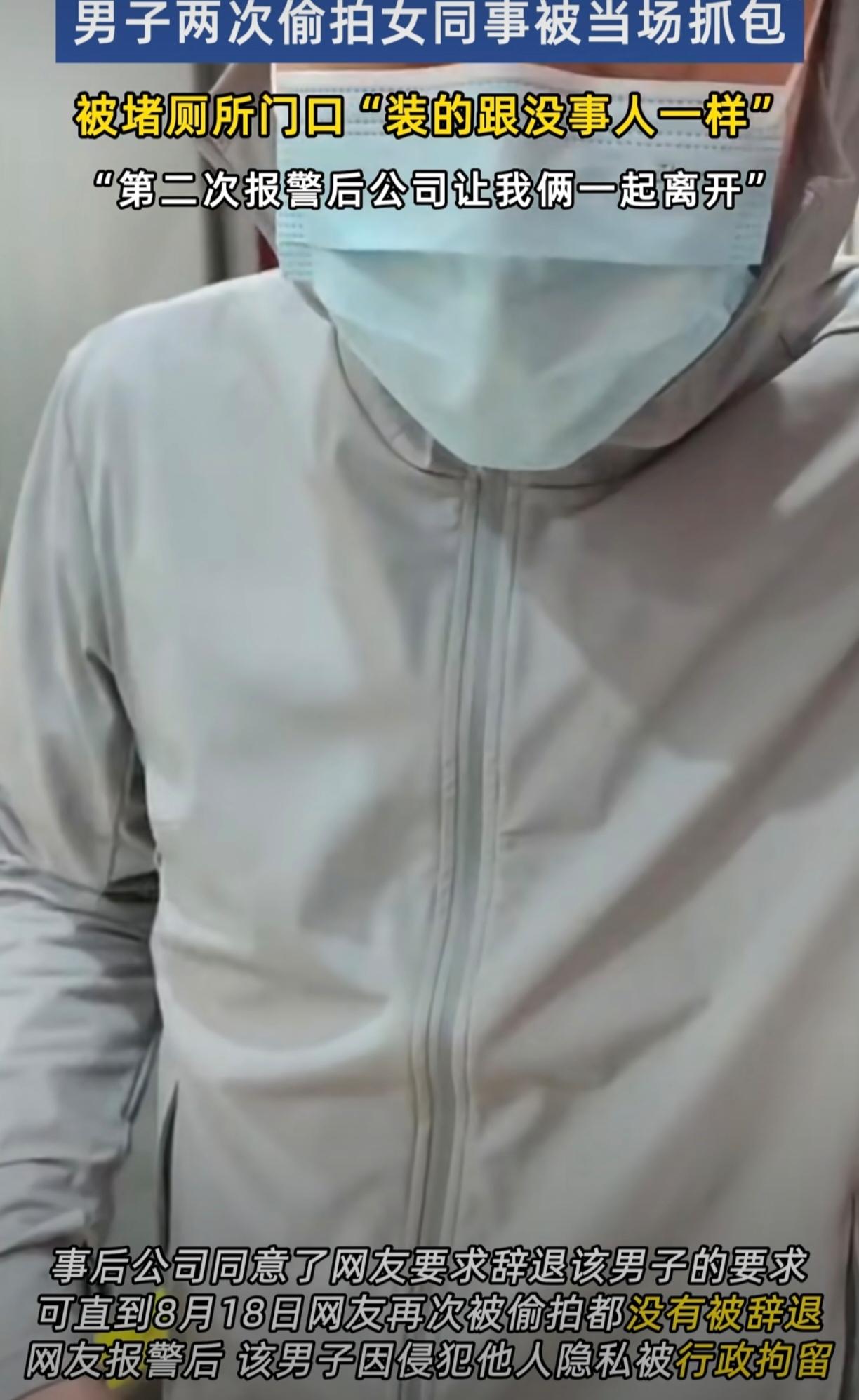 这是什么类型的变态,一男子半年内竟然两次偷拍女生上厕所。第一次偷拍就被抓个正着,女生为了公司的声誉没有报警,选择了和解,没想到这都没让男子不长记性。第二次被偷拍后,女生果断的选择了报警。但此时没想到自己一直维护的公司此时为了声誉竟然要求女生和男子一起离职。公司还表示:第一次被拍,女生没报警,但是拿到了赔偿,女生不吃亏。 真是离了大谱。该走的没走,不该走的到反而一起被处理,这样的公司也真是奇葩。社会新闻 色狼偷拍