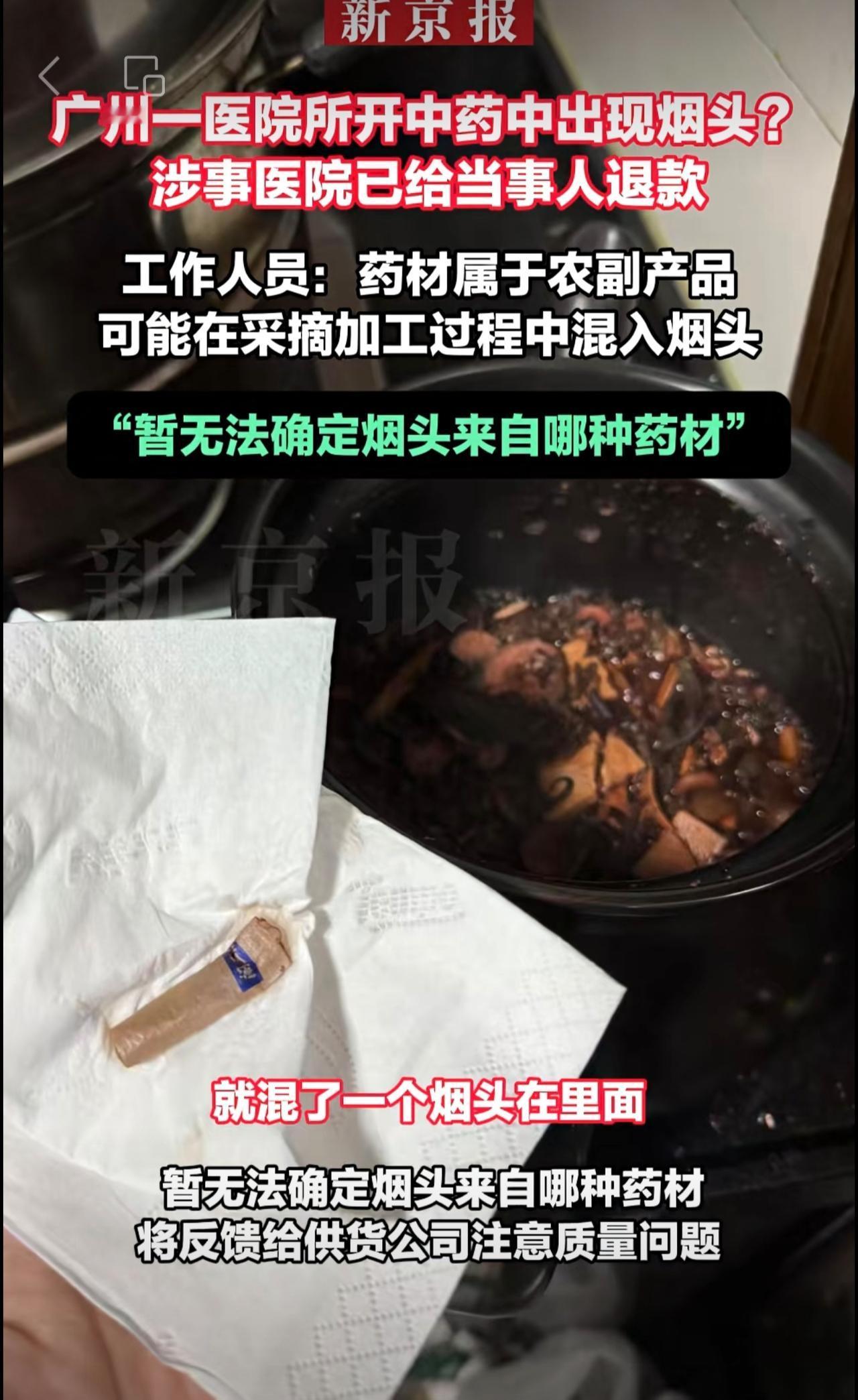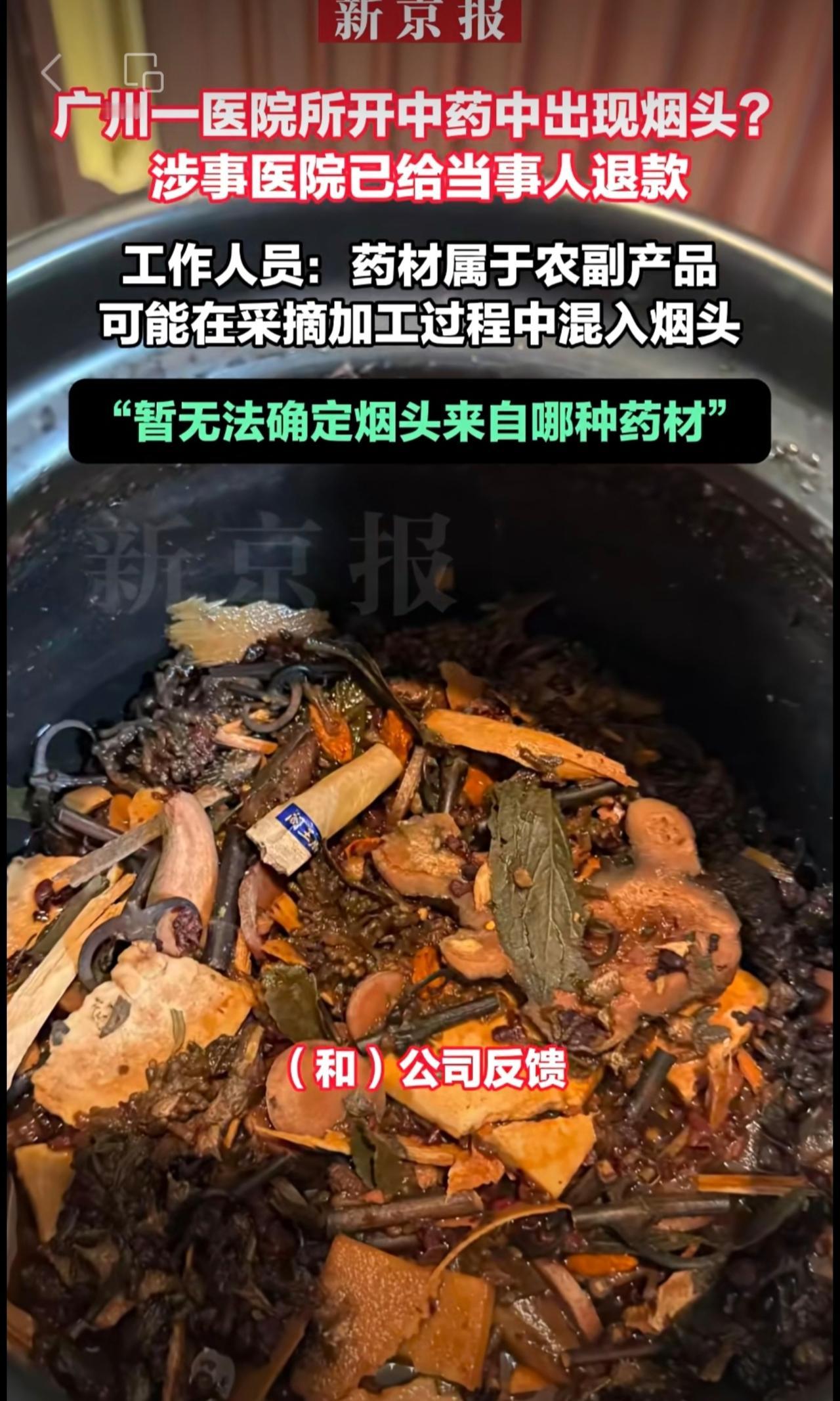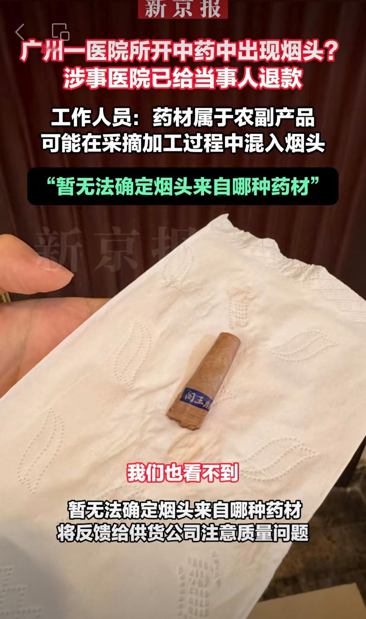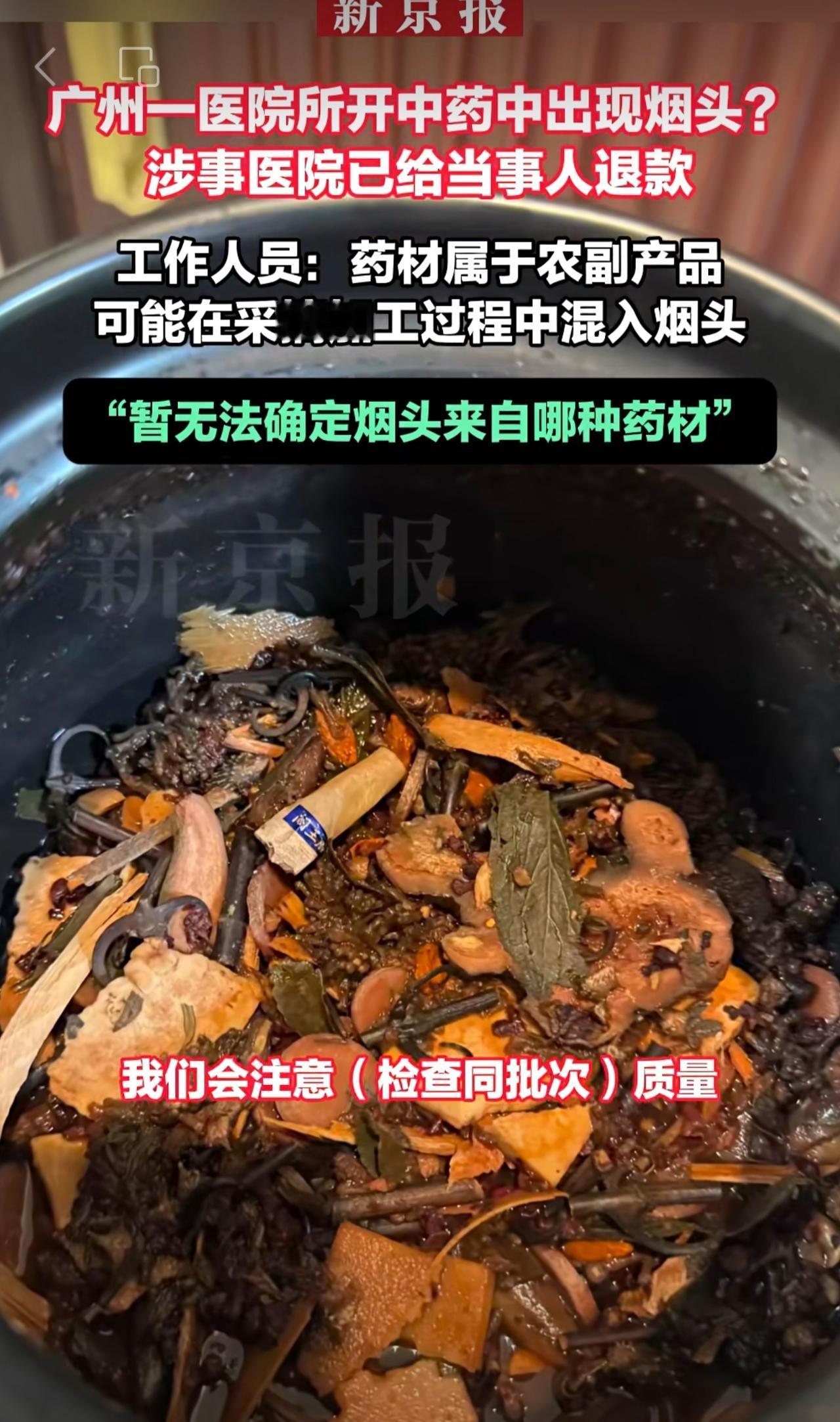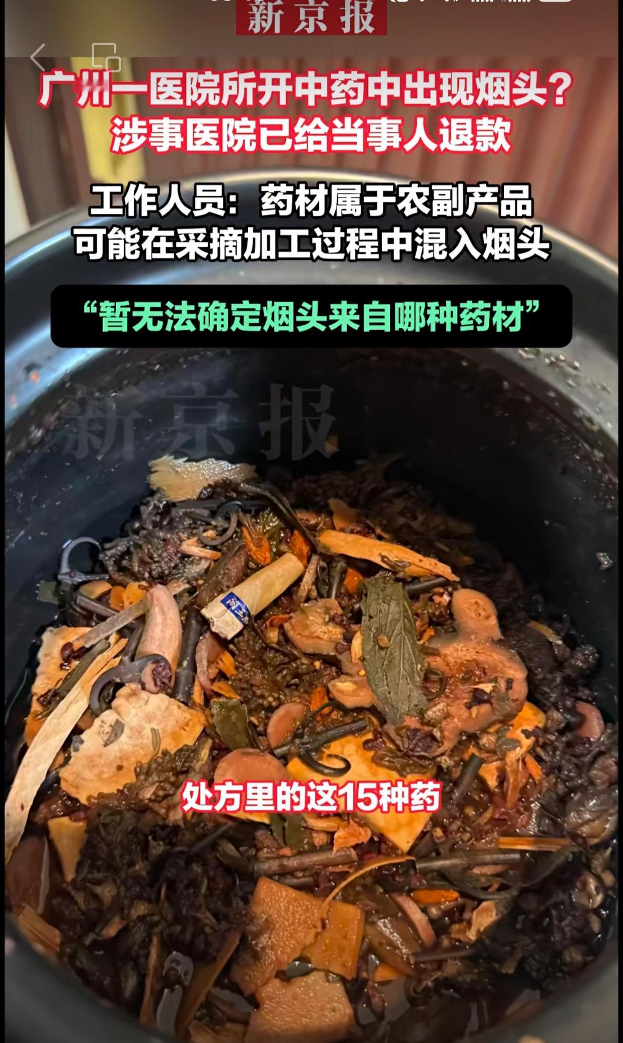 院方回应医院所开中药中出现烟头:已联系当事人退款将反馈供货商注意质量