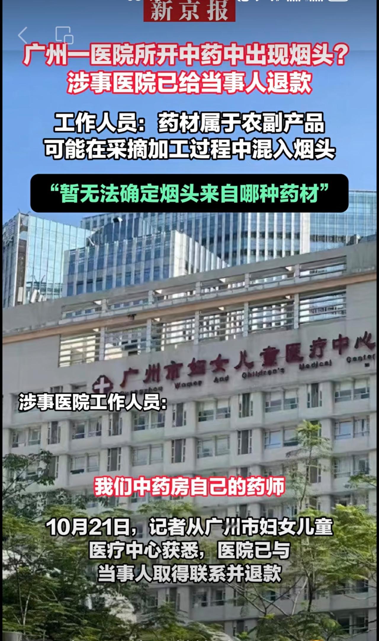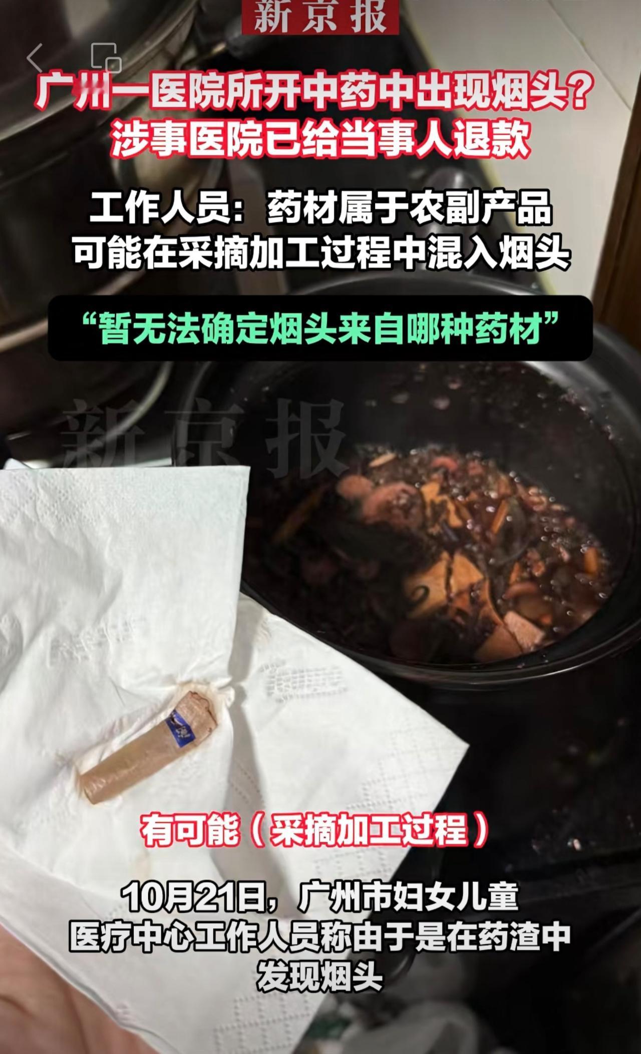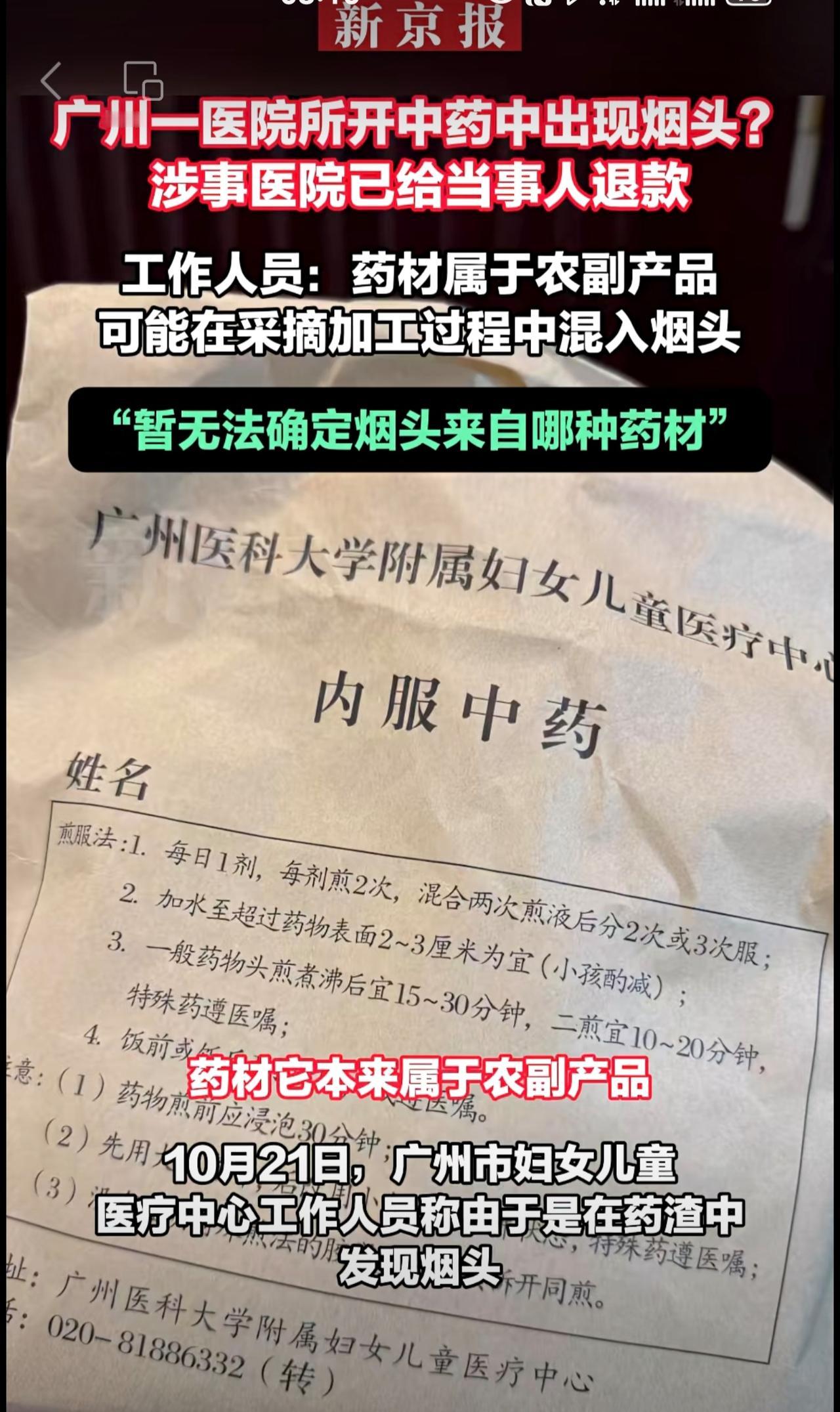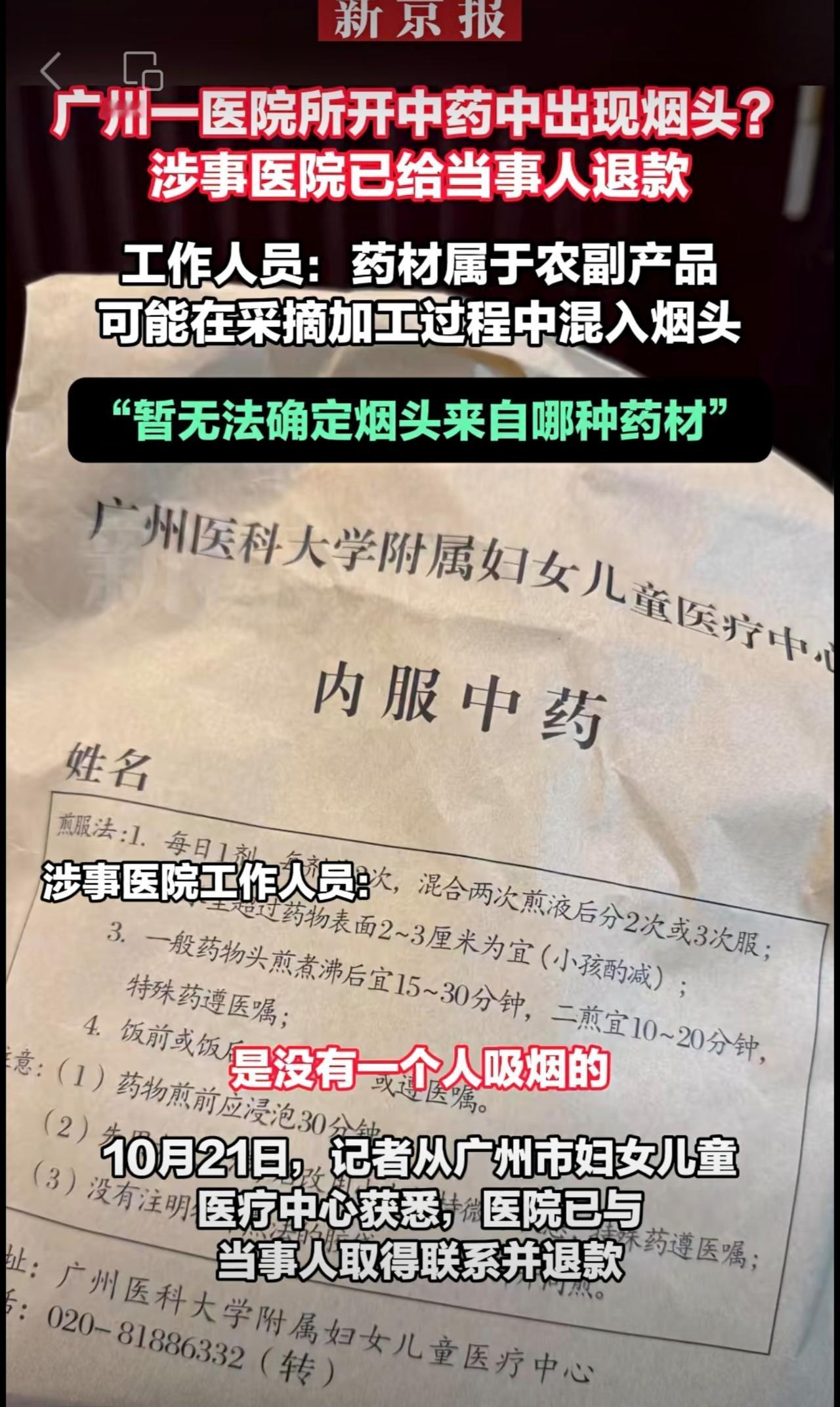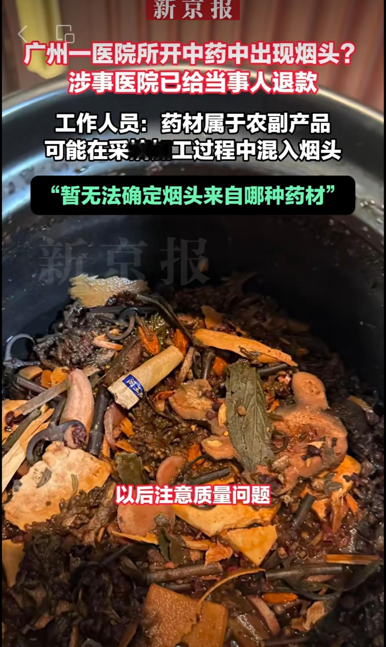 院方回应医院所开中药中出现烟头:已联系当事人退款将反馈供货商注意质量