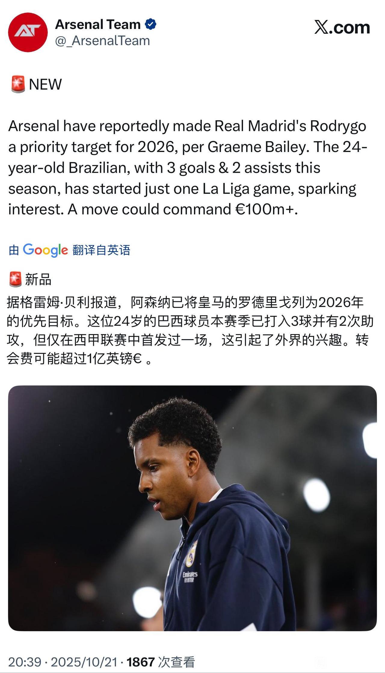 阿森纳球迷看到这个新闻笑死了,媒体说阿森纳1亿英镑求购罗德里戈?? 今年夏天都不想买,证明是皇马炒作。 明年再花巨资购买?阿森纳高层敢这么做? 罗德里戈在皇马都无法出场,连数据都没有了,2000万都嫌多,坚决不买!![笑哭] 说实话西甲只有姆巴佩和阿尔瓦雷斯能入英超豪门的眼!![大金牙]