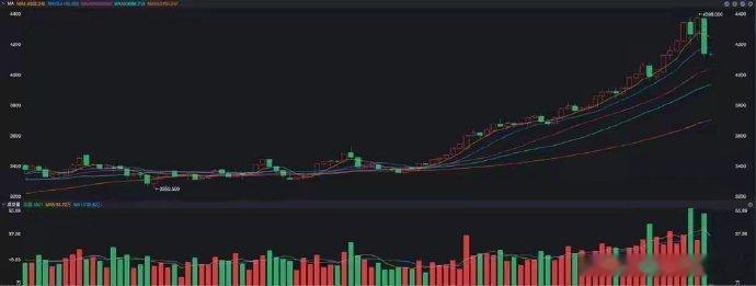 现在的关键问题是,这波金价到底能调整到哪里呢?我觉得短期内先看20日线支撑,也就是4000美元每盎司,主要是看在这个位置,市场的主动性买盘会不会出现,如果说4000美元无法获得比较强的买盘,那下一个目标位就是3800美元一带了,也就是现在的60日线附近。