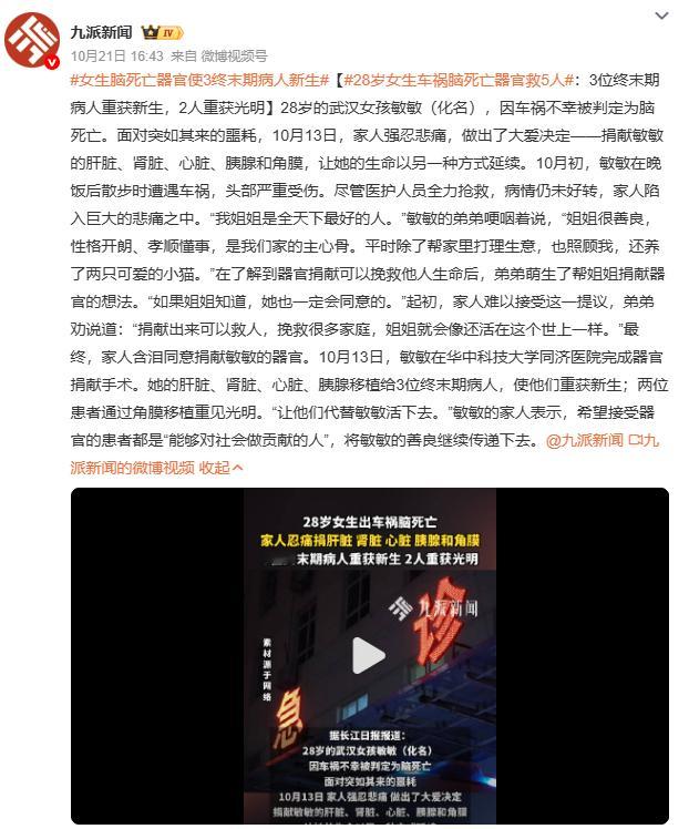 28岁女生车祸脑死亡器官救5人太痛心了😔28 岁武汉女生敏敏晚饭后散步遭车祸脑死亡,家人捐献其器官救 5 人。