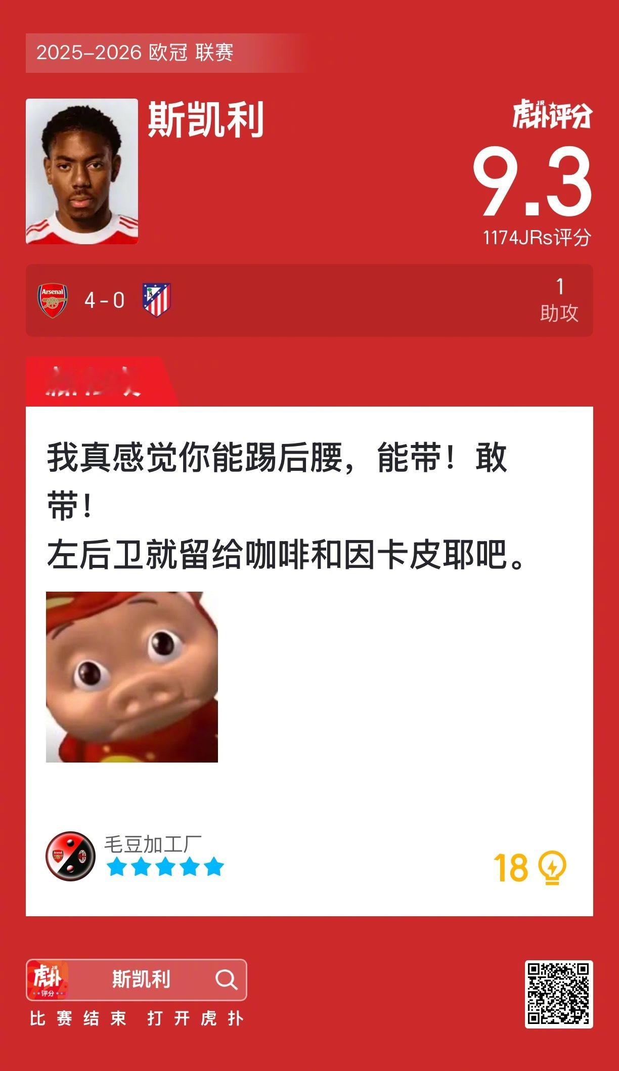 阿森纳4比0马竞斯凯利贡献一次助攻,赛后收获9.2的虎扑评分!