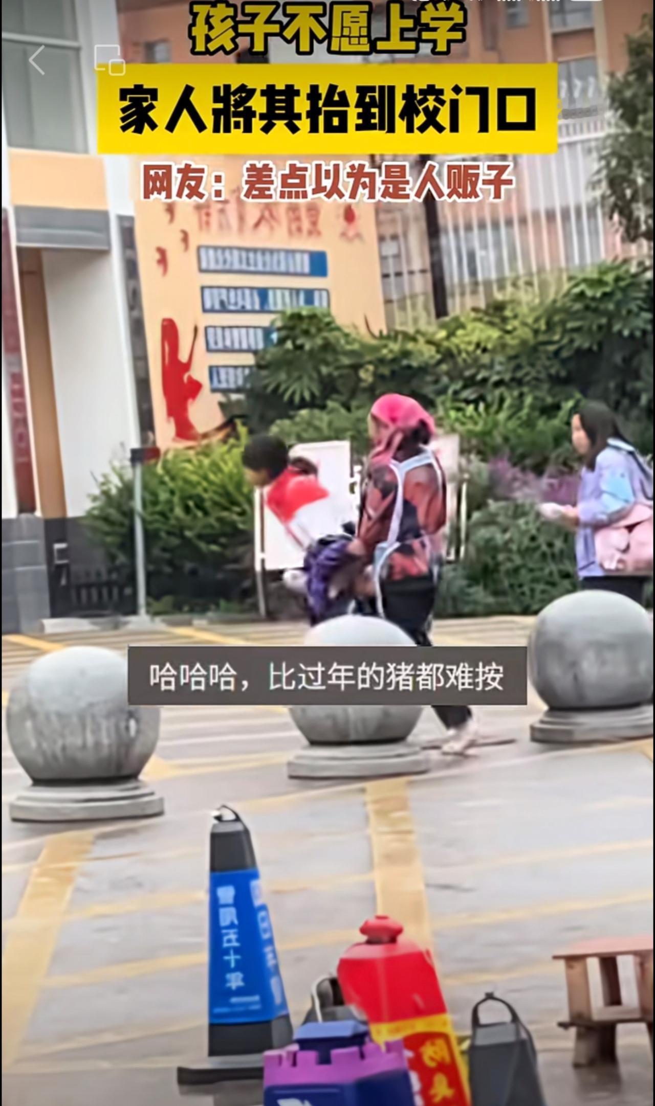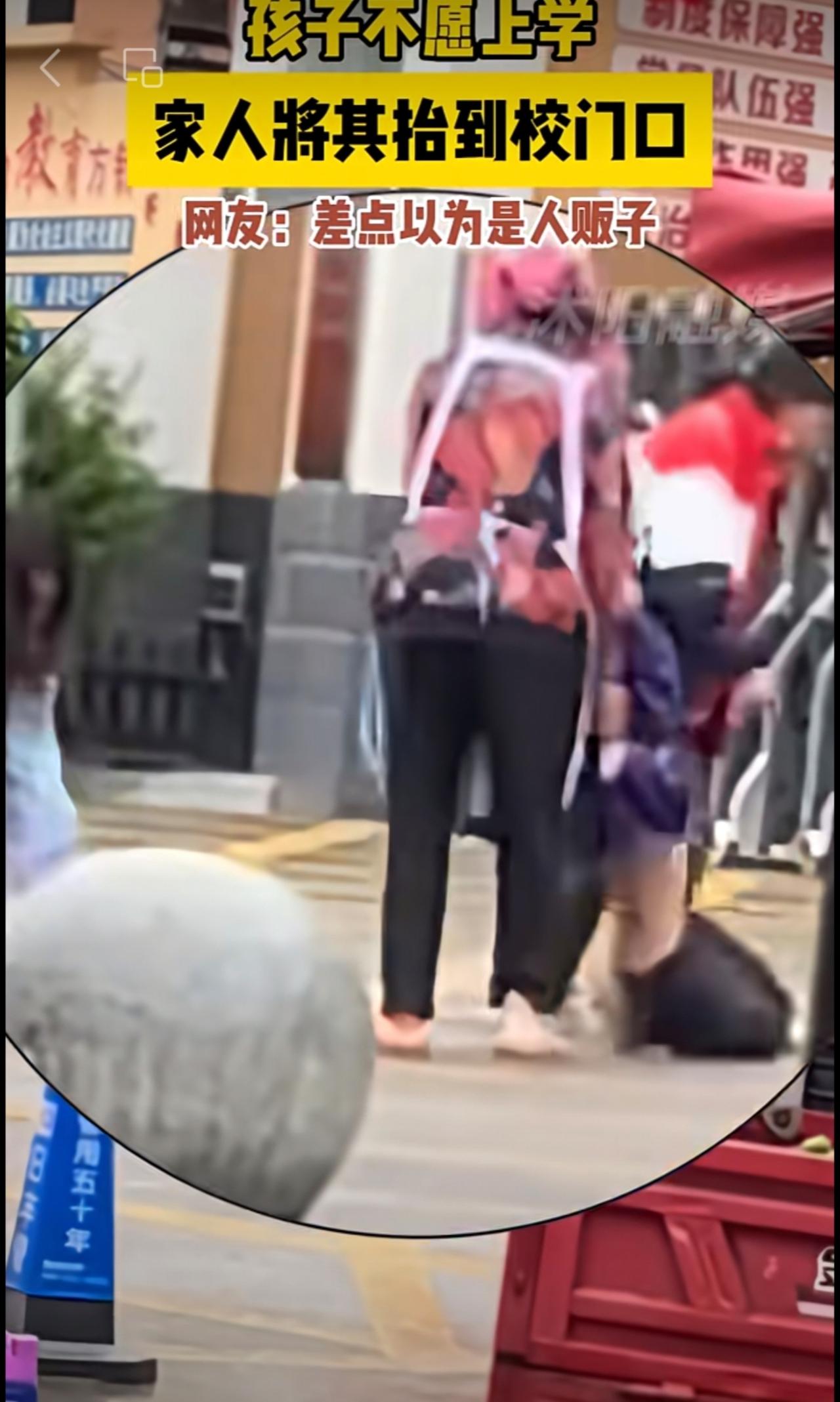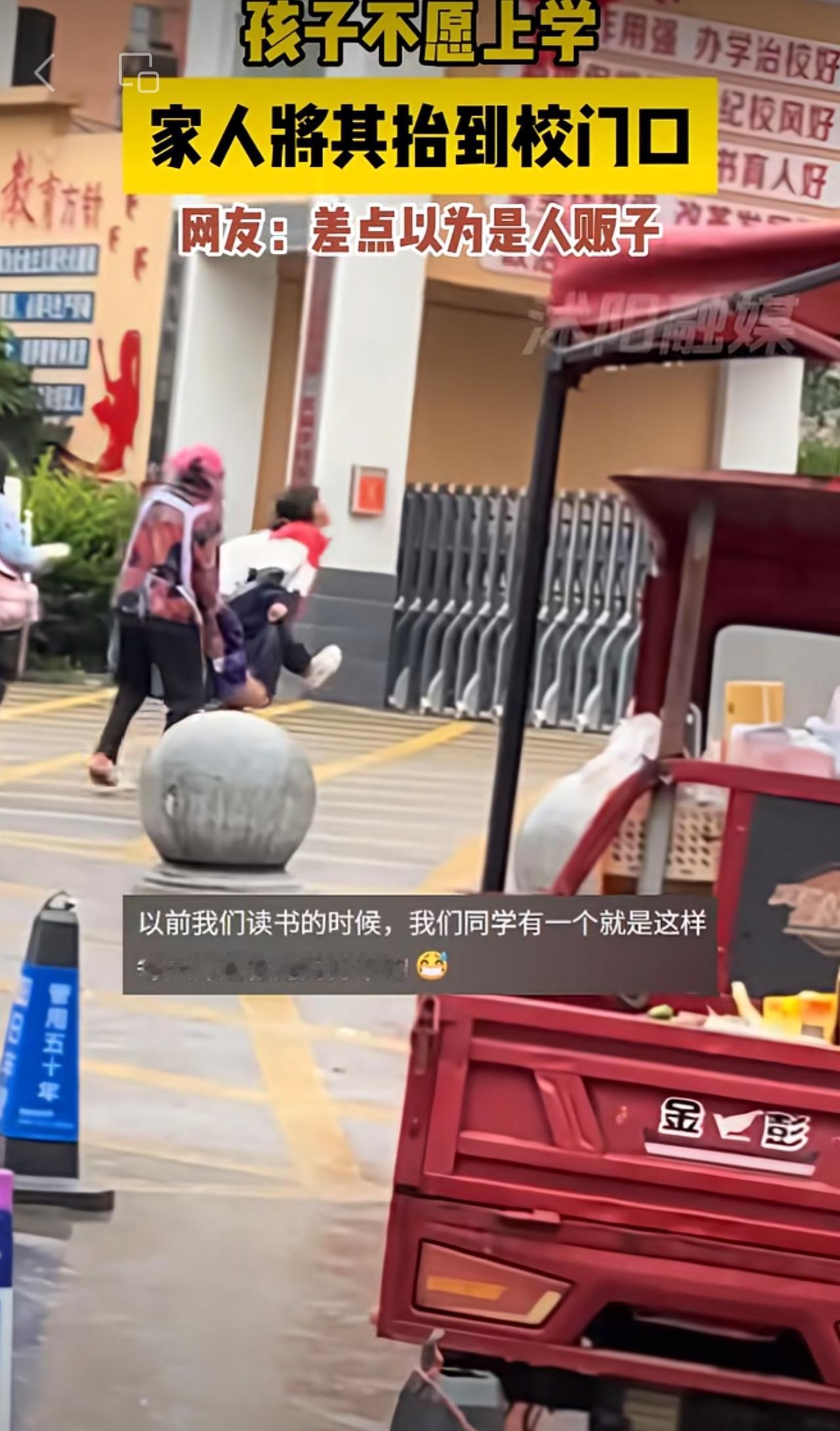 孩子不愿上学,家人将其抬到校门口,网友:差点以为是人贩子