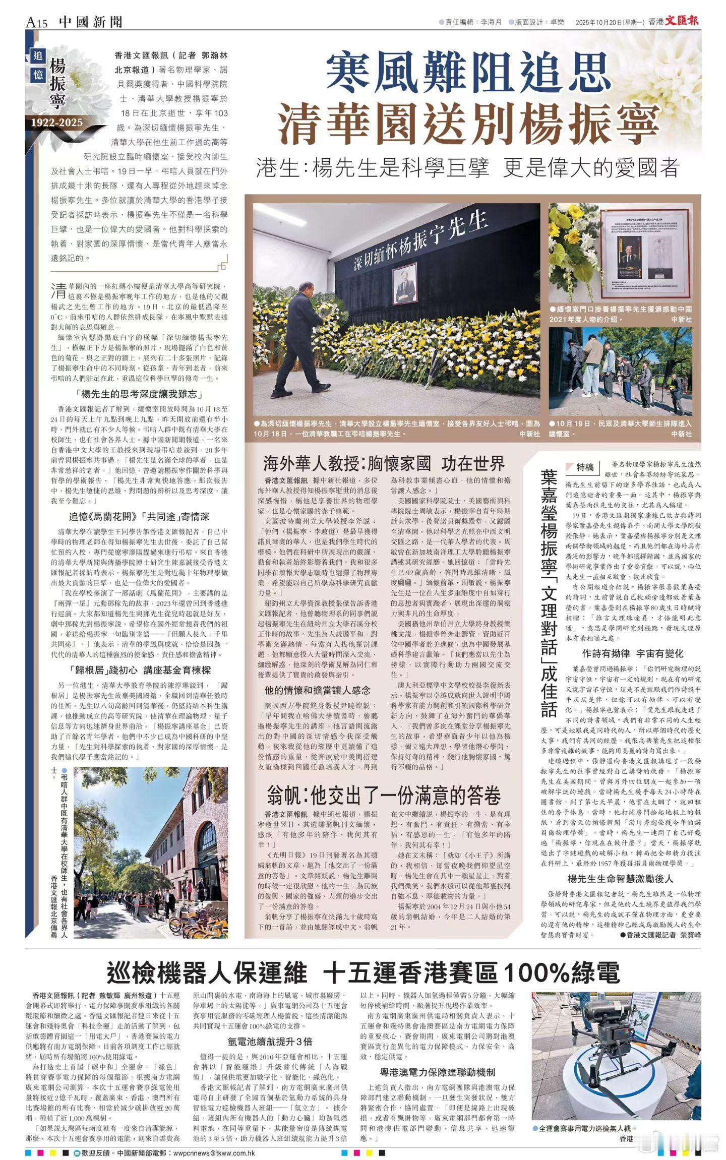 来自香港的清华大学自动化系研究生林诚皓向大公报记者表示,杨振宁先生于1954年提出的非阿贝尔规范场理论(即杨─米尔斯理论),刻画了自然界中除引力之外的所有已知基本相互作用,相关研究对他带来很大的启发——白熊北京报道。