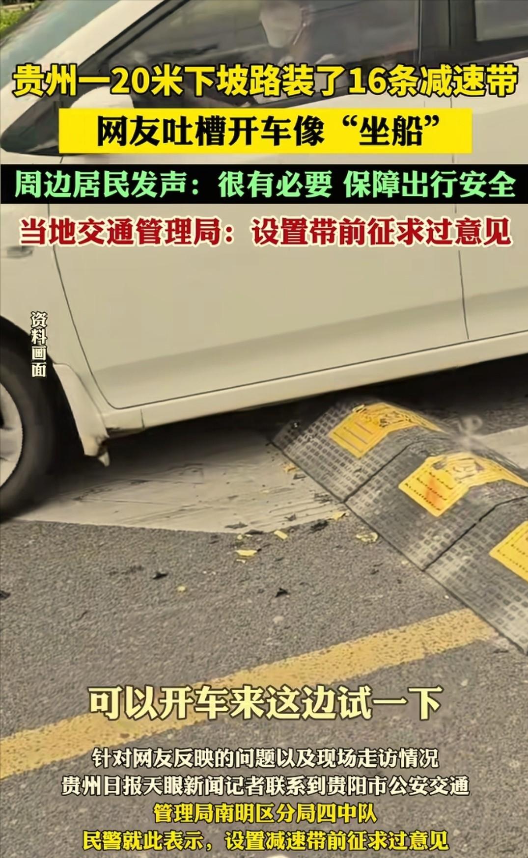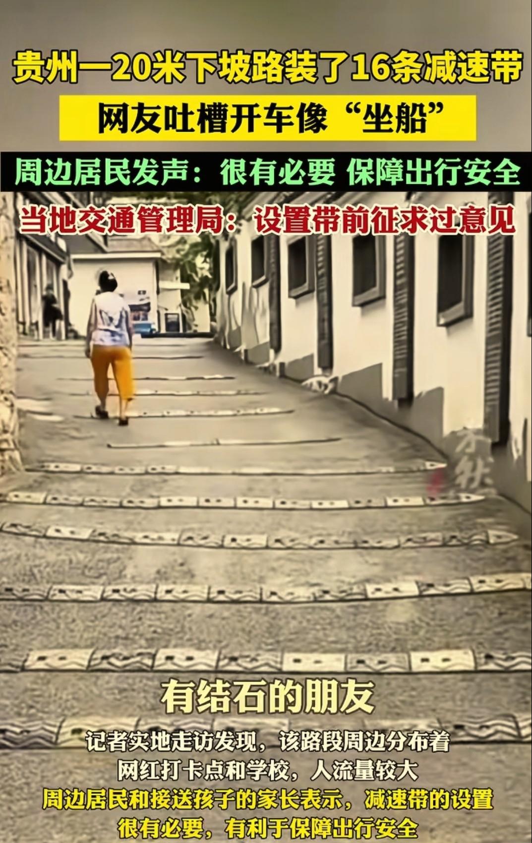 贵州贵阳,20日报道,一网友去游玩后反映:当地一条巷子里20米的下坡路,居然装了16条减速带!开车下去的颠簸感,就和坐船一样,有结石估计都能颠出来,网友认为这给行人和车辆出行来带了极 大的不便,没想到,当地相关部门的回应却出乎意料。[紫薇别走] 这段路的两侧,一边是热闹的网红打卡点,吸引不少游客前来拍照;另一边则是一所学校,上下学时段有许多学生和家长通行,由于人流量大,道路本身又比较狭窄,车辆在此处会车相当困难,正是这样的特殊环境,导致了减速带的大量出现。 减速带的设置并非越多越好,根据《城市道路交通设施设计规范》,连续减速带之间的间距建议为6米左右,而翠微巷这段路平均1.25米就有一条减速带,远超标准。 过于密集的减速带不仅影响行车舒适度,还可能增加车辆轮胎、底盘的损耗,甚至存在安全隐患,《贵州省环境噪声污染防治条例(草案)》中也明确提出,城市道路不得随意设置减速带,确需设置需经多部门论证并提前公告。 这条翠微巷的道路应该是一条允许车辆通行的背街小巷,还是一个应限制机动车进入的开放式步行街?如果能明确这个问题,当前的矛盾或许能找到更好的解决思路。 如果被明确为步行街,机动车限行后自然无需如此密集的减速带;如果确定为车辆通行道路,或许可以通过实施单行、设置物理隔离或采用“蛇形弯彩色路面”等更温和的减速设计来替代,在保障安全的同时提升通行体验。 安全无疑是首要原则,但实现安全的方式可以更加科学、人性化,这件事也提醒我们,有效的城市治理需要更细致的规划、更透明的沟通以及更创新的技术方案。 网友热评: “这段路一边是学校,一边是网红打卡点,每天上下学时候,孩子、游客特别多,路又窄,车子不强制减速哪能行?” “虽然开车过是有点颠,但跟孩子们的安全比起来,这点不便利完全可以接受。” “这哪是减速带,简直是‘震动模式’全开!开车过去就像坐小船,颠得人七荤八素,对车子悬挂也是考验。” “这要是车上有点小零小碎,或者有肾结石,估计都能给颠出来。” “装减速带的初衷是好的,但能不能优化一下?比如减少几条,或者改用更平缓的振动标线?” 如果你有权来规划这段路,你会怎么做?是支持保留现有减速带,还是有什么更好的高招,能在保障安全的同时提升通行体验?欢迎在评论区分享你的“锦囊妙计”! 信源:天眼新闻