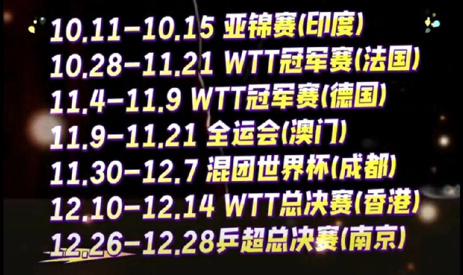 赛事密集,国乒第四季度赛程来袭,10月5日,中国大满贯大幕落下,中国队包揽5项冠军。 王楚钦、王曼昱分获男女单打冠军,接下来,各项大赛接踵而至: 1、10月11日-15日,亚洲锦标赛,印度。 2、10月28日-11月2日,WTT蒙彼利埃冠军赛,法国。 3、11月4日-9日,WTT法兰克福冠军赛,德国。 4、11月9日-2日,港珠澳全国运动会,中国澳门。 5、11月30日-12月7日,成都混合团体世界杯,中国成都。 6、12月10日-14日,WTT总决赛,中国香港。 7、12月26日-28日,中国乒超联赛总决赛,中国南京。 其中,最重要的比赛,也是时间持续最长的比赛,无疑会是4年一度的全国运动会。
