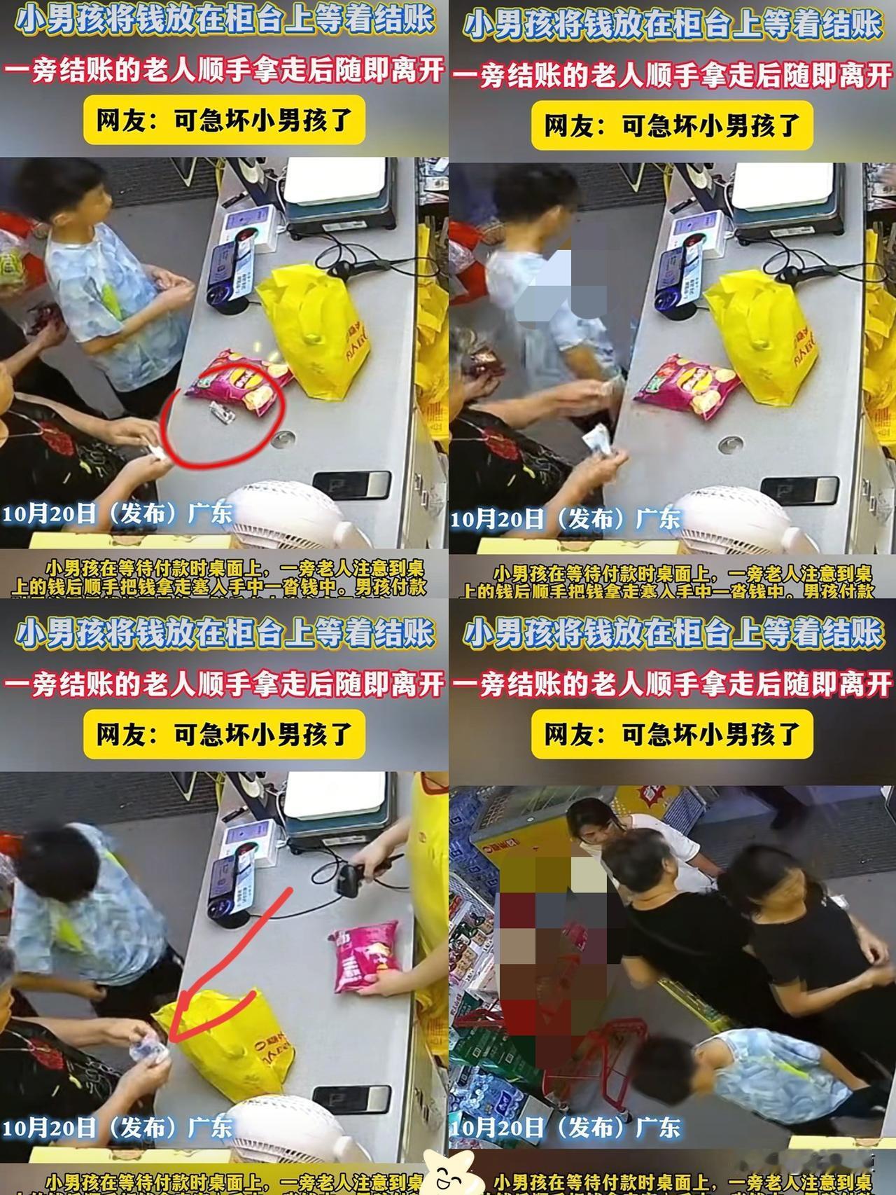 “人心最可怕”!广东, 小男孩结账时把钱放柜台, 转头捡东西的瞬间旁边大妈的操作太绝了 先抬头死死瞄了眼孩子,确认他没注意,手疾眼快把钱攥进手里,还假装淡定扒拉自己的零钱! 孩子回头发现钱没了,急得眼圈发红,在柜台边翻来覆去地找,大妈却全程低头装瞎,连眼皮都没抬一下,结完账头也不回地溜了! 她以为做得天衣无缝,殊不知监控把“瞄一眼、火速拿、装没事”的全程拍得清清楚楚! 有人替大妈辩解是误会,可拿钱前的“观望试探”、拿钱后的“无视装傻”,再加上售货员后来找她钱时照单全收! 这哪是误会,分明是故意占小孩的便宜!年龄从来不是道德的挡箭牌,连孩子的钱都惦记,丢的不只是面子,更是做人的底线! 对此大家怎么看?
