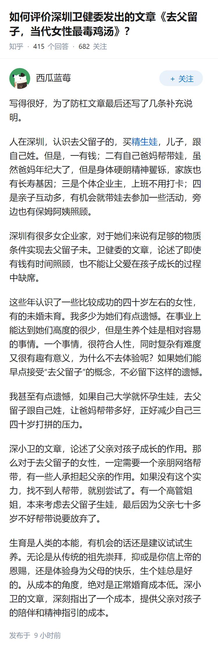 如何评价深圳卫健委发出的文章《去父留子,当代女性最毒鸡汤》?