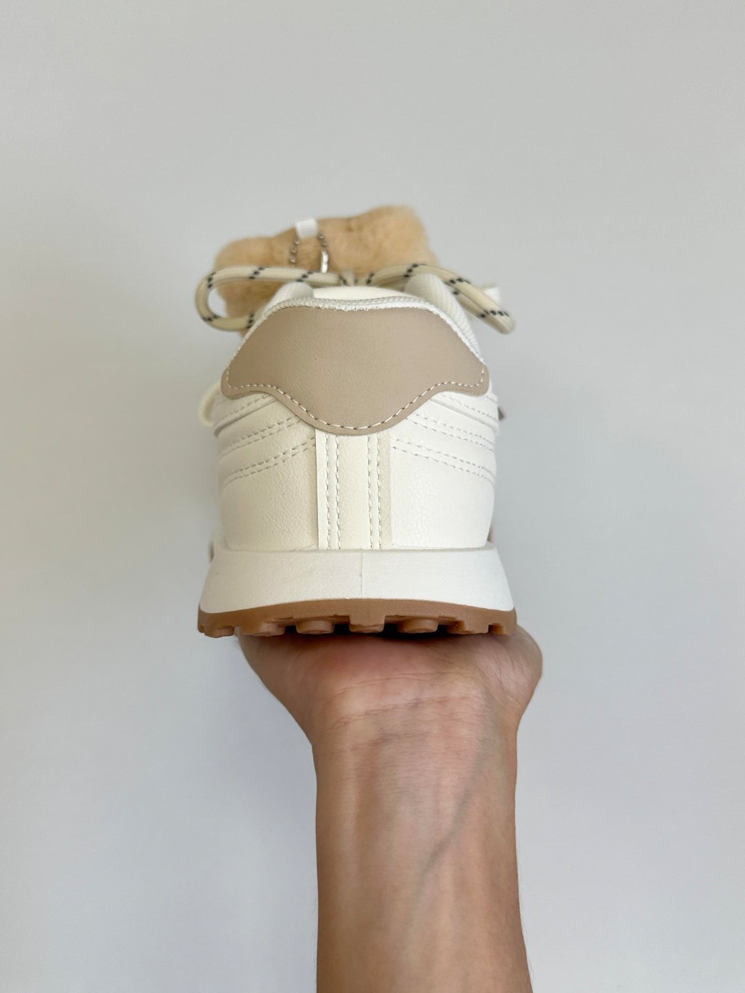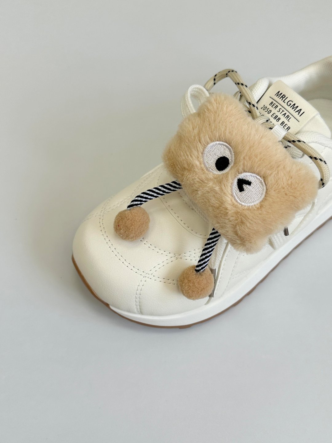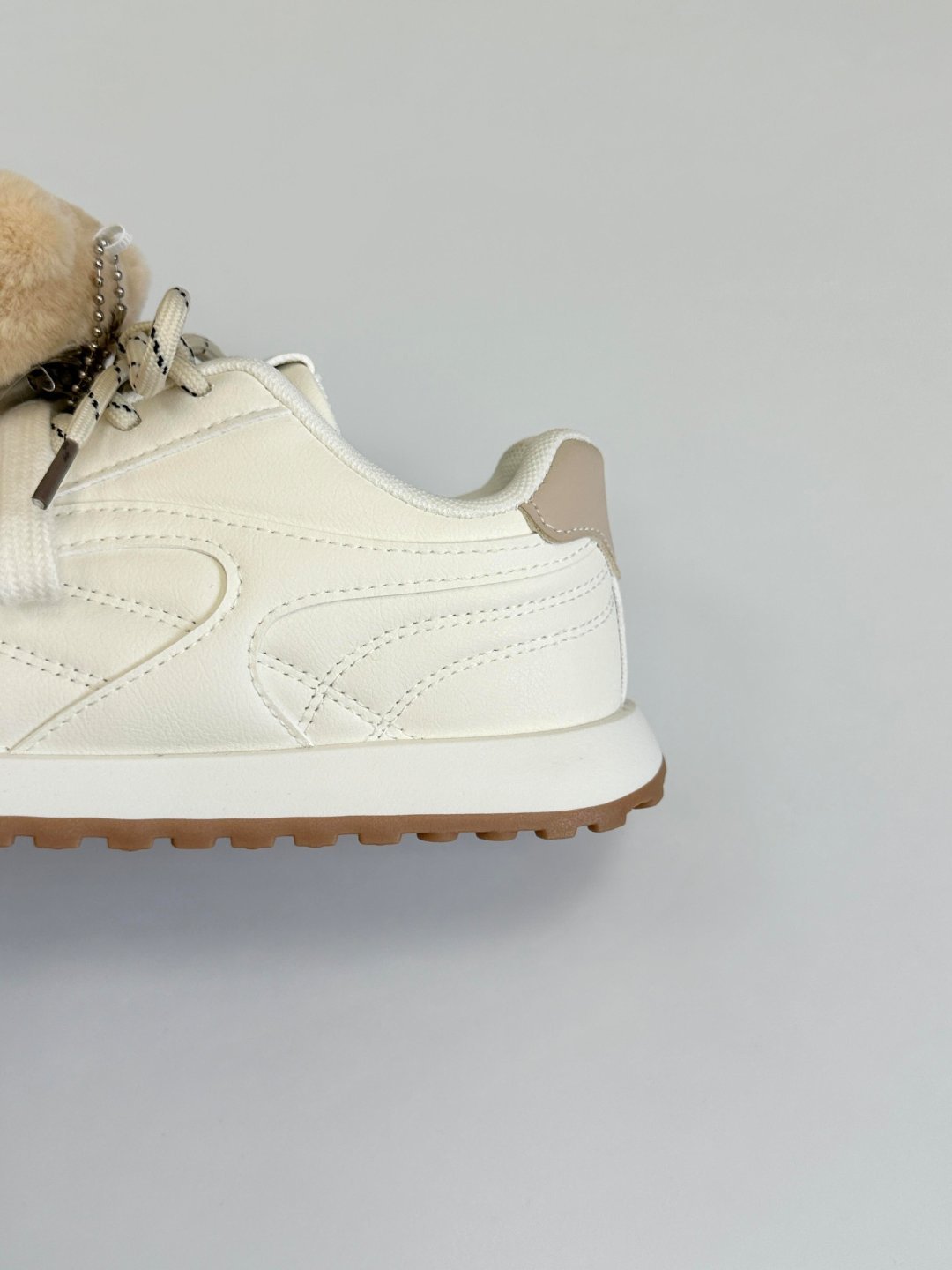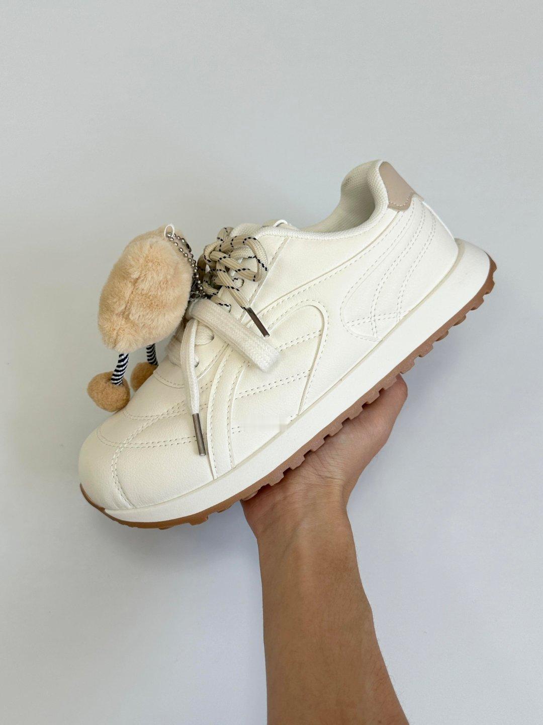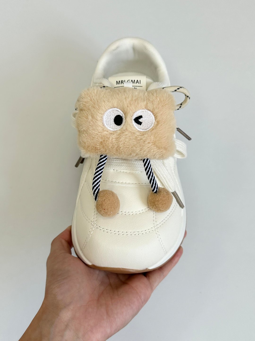 这款奶白色休闲鞋自带“萌系buff”,干净的米白皮质,搭配浅棕生胶底,简约又温柔。鞋带上的毛绒小挂件是灵魂——圆眼+条纹“触角”+毛球“小脚”,软乎乎的质感像把玩偶穿在了鞋上,甜趣又治愈。鞋舌的标签细节增添了复古运动感,整体风格适配卫衣、百褶裙等多种穿搭,踩上就是元气满满的日常。