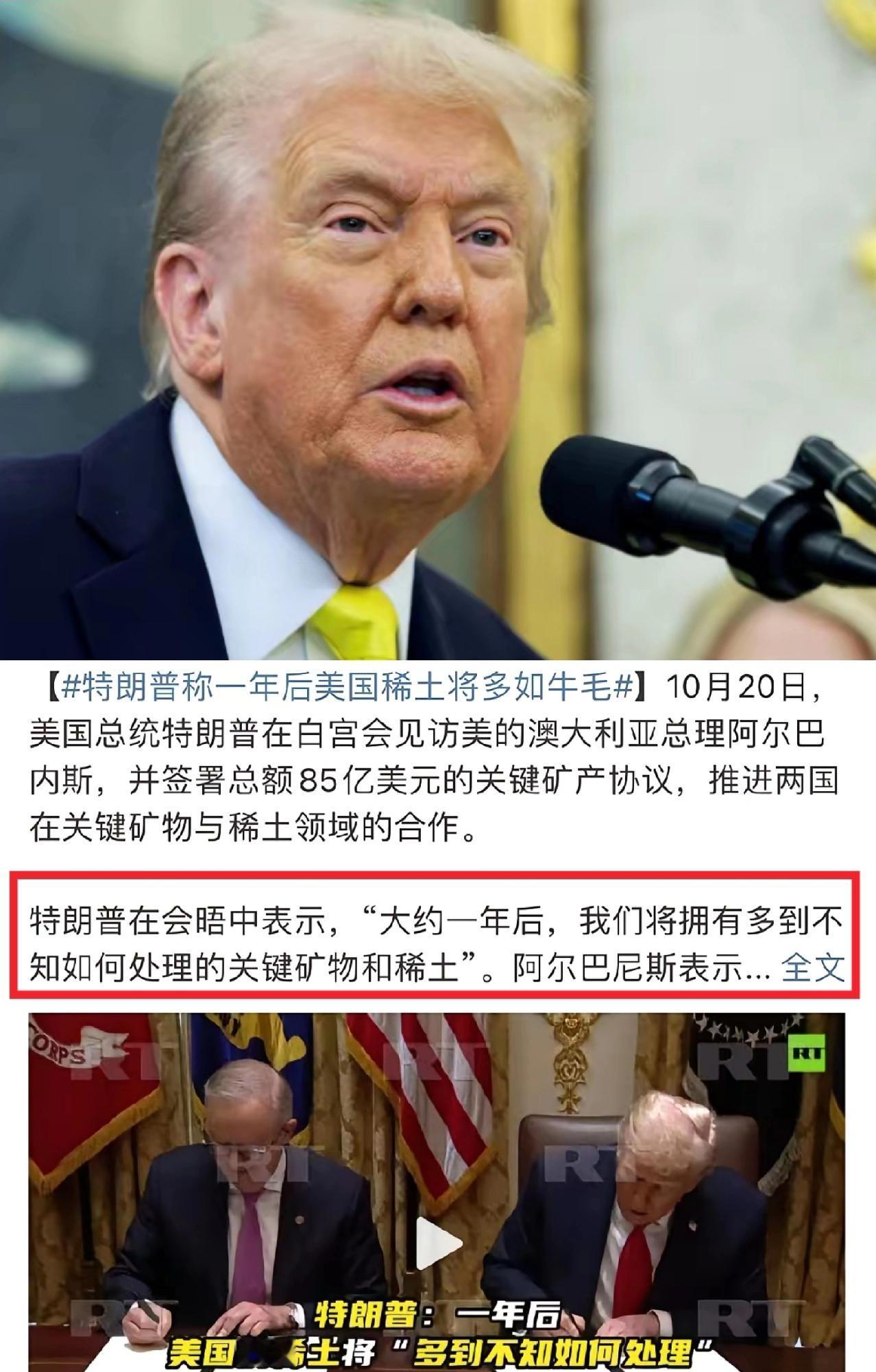 特朗普也说大实话。在20日与澳大利亚总理阿尔巴内斯签署了85亿美元矿产协议后,特朗普表示:“大约一年后,我们将拥有多到不知如何处理的关键矿物和稀土。” 这里,特朗普说的是可直接用于像F-35和高端芯片这样的高科技产品的锗镓吗?当然不是。特朗普明确说了是没有经过提炼精炼的“多到不知如何处理的关键矿物和稀土”。这句话妙就妙在特朗普说的“不知如何处理”这几个字。“不知如何处理的关键矿物和稀土”顶个屁用?多到就像美国的大豆一样堆积如山又能如何?但我们依然为一向夸夸其谈的特朗普能够痛改前非地实话实说感到“高兴”。 这么说吧,如果高志凯博士曾说过佩洛西能活着看到统一,那现在可以说,特朗普活着也看不到美国能把稀土自给自足的问题解决了。所以,特朗普,死心吧。