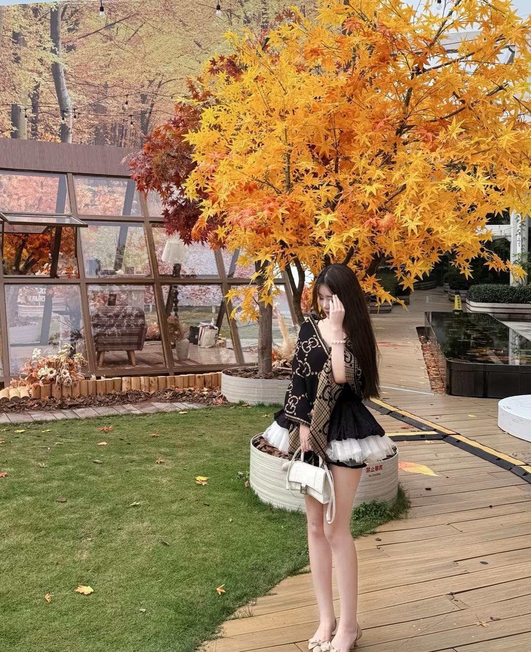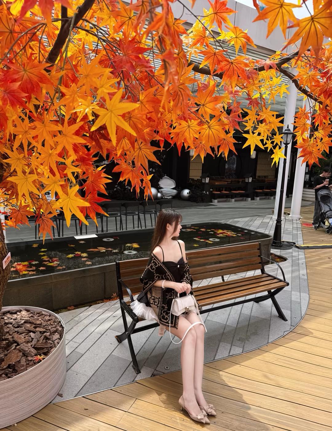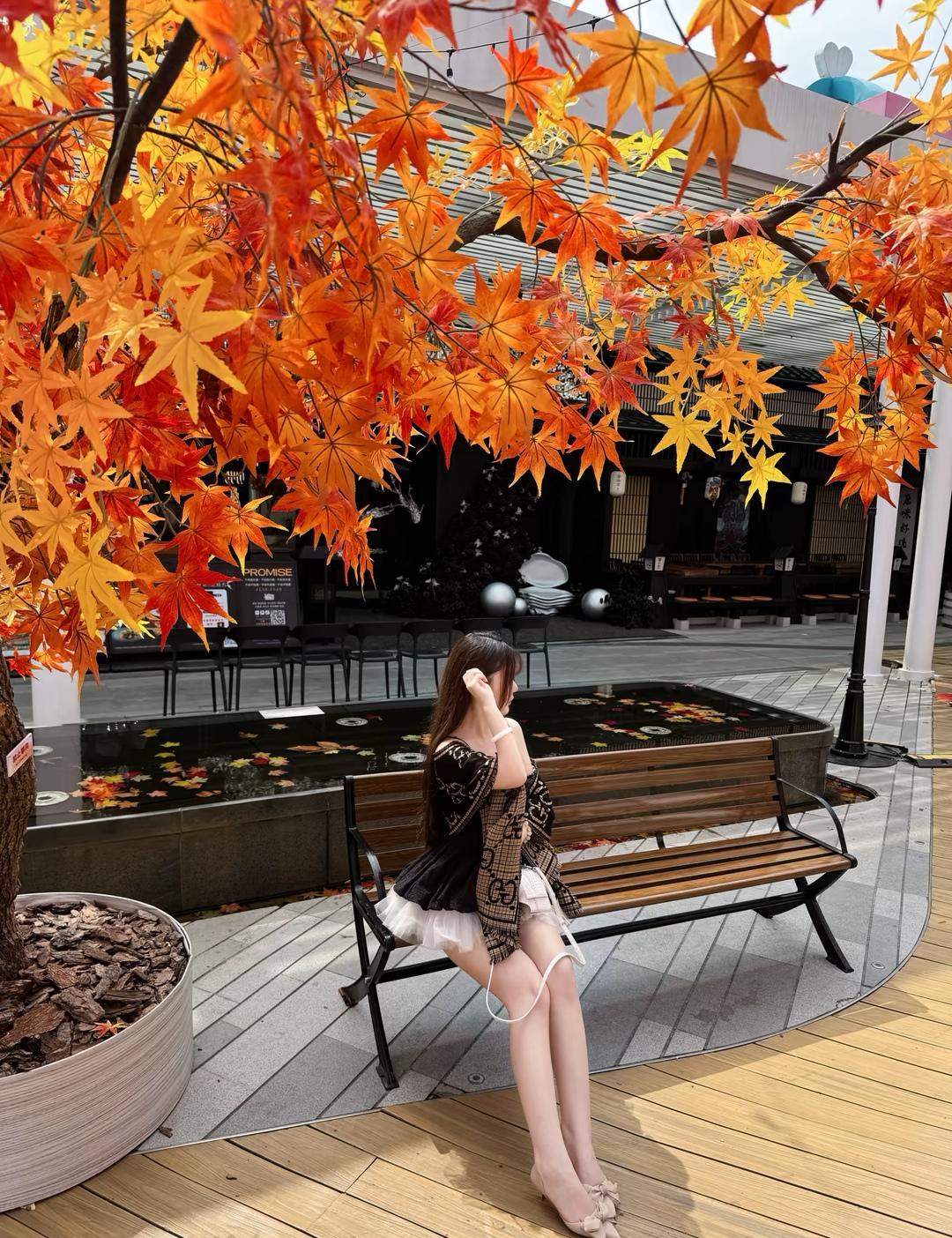 秋日暖阳下,红叶如火,少女静坐长椅,沉思时光。