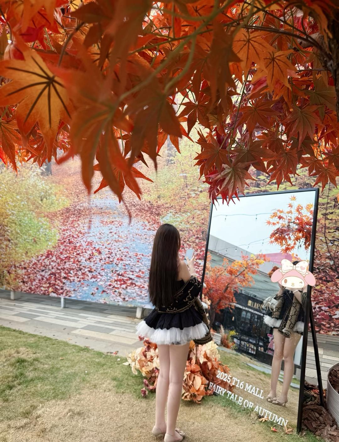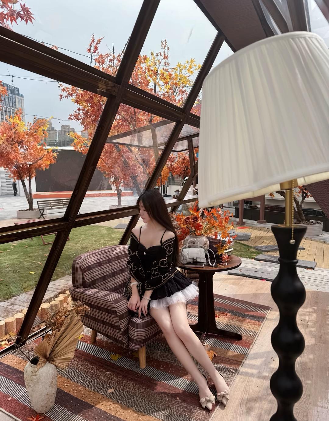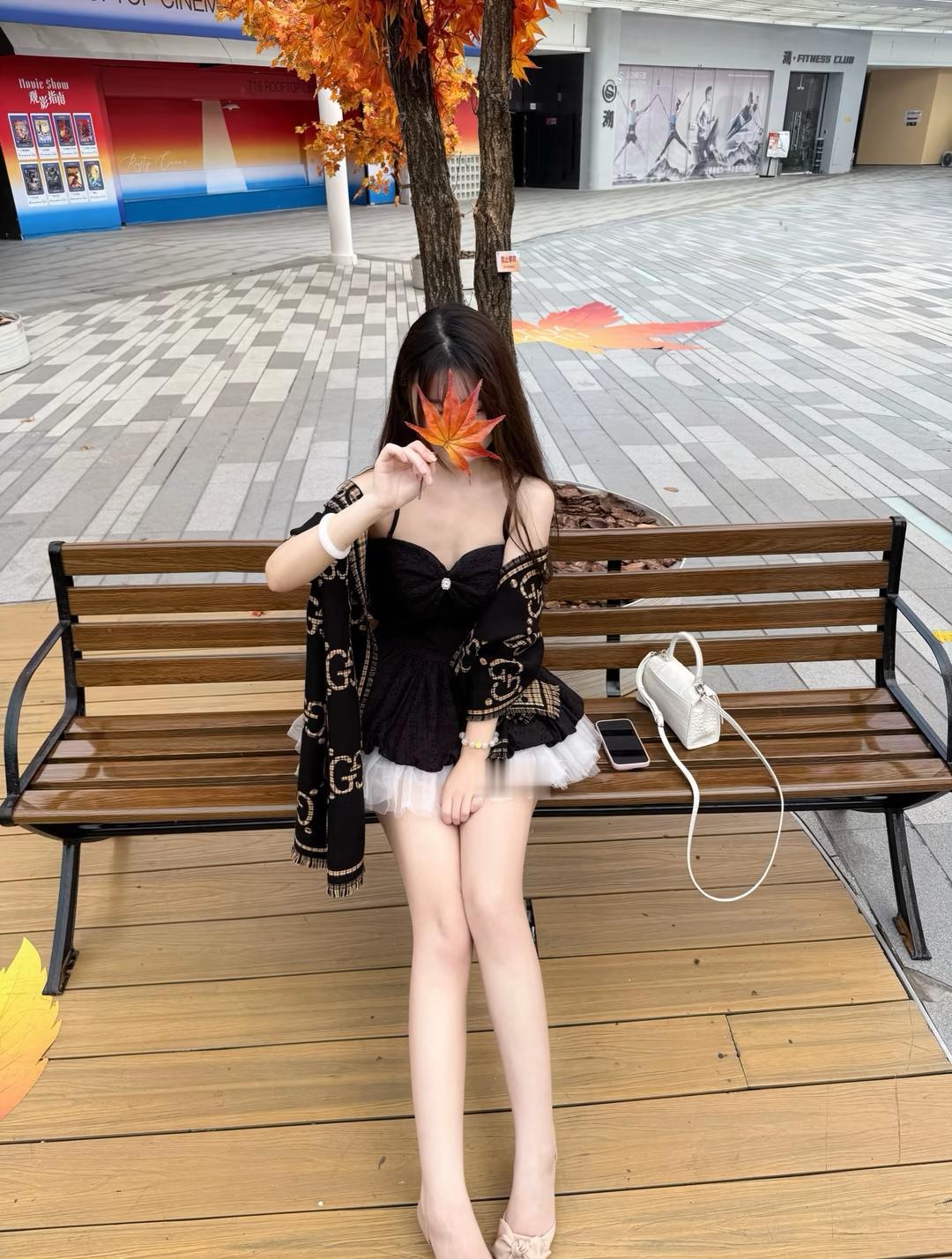秋日暖阳下,红叶如火,少女静坐长椅,沉思时光。