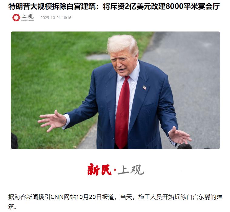 特朗普下令把白宫东翼给拆了,准备修建更大的宴会厅! 10月20日,根据多家媒体拍到的现场画面,白宫东翼已经有部分建筑被围起来拆除,接下来要在这片地上建一个超大宴会厅——规划占地足足8000平方米,能同时容纳650人搞大型活动,整个项目算下来要花近2亿美元。 项目方说,这笔2亿美元的钱不是用纳税人的钱,是特朗普自己掏一部分,还有个没透露名字的“捐赠者”出一部分。 可问题是,现在美国正处在难的时候。政府的停摆从10月1日到现在仍未有结束的动向,几十万联邦雇员拿不到工资,有的海关人员、公园管理员只能自愿上班,甚至有美军家属因为没收入要去食品银行领救济。 这种时候不去想办法解决大家的吃饭问题,反而花大价钱盖宴会厅,任谁看了都会觉得不对劲,舆论自然炸开了锅。 国会里的民主党议员首先站出来反对,不少人接受采访时都说,不管钱从哪来,这个时候搞这种工程就是不分轻重。参议院预算委员会的人也表示,现在最该做的是赶紧通过预算法案,让公务员能拿到工资生活,而不是把精力花在这种“撑场面”的事情上。 普通民众的反应更是激烈,社交媒体上相关话题一天内就有上百万条讨论,很多网友都说这是“优先级摆错了位置”,就算是私人出钱,也得考虑全国的难处,不能这么高调铺张。 更何况,白宫现在的场地也足够用的,之前办国宴、大型发布会,哪怕是接待外国元首的活动,现有的宴会厅都能应付,从来没听说过场地不够用的情况。这次非要建这么大的宴会厅,不少人都觉得特朗普就是为了追求“气派”,要个视觉上的震撼效果。 另外那个神秘“捐赠者”也成了谜,联邦道德委员会已经收到好几封质询信,要求公开这个人的身份,怕的是背后有利益交换——毕竟能拿出这么多钱的捐赠者,很难不让人猜测是不是想通过这种方式跟政府搭关系。 更让人在意的是,政府停摆带来的麻烦越来越多:国家公园因为没人管理,有的地方垃圾堆积如山;食品药品监管局的检查延迟,部分食品企业的审批卡壳;甚至老百姓办护照、签证都得排更久的队。 美国百姓都盼着政府能赶紧正常运转,把钱花在刀刃上,结果却看到白宫在拆东翼盖宴会厅。 到现在为止,白宫还没对这件事正式回应,拆除工程倒是没停,还在按计划推进。但从国会的质疑和老百姓的讨论来看,这个“超大宴会厅”计划肯定不会顺顺利利就能完成。毕 这种时候做出这样的决策,最后会带来什么样的政治影响,还得等着看后续的发展。