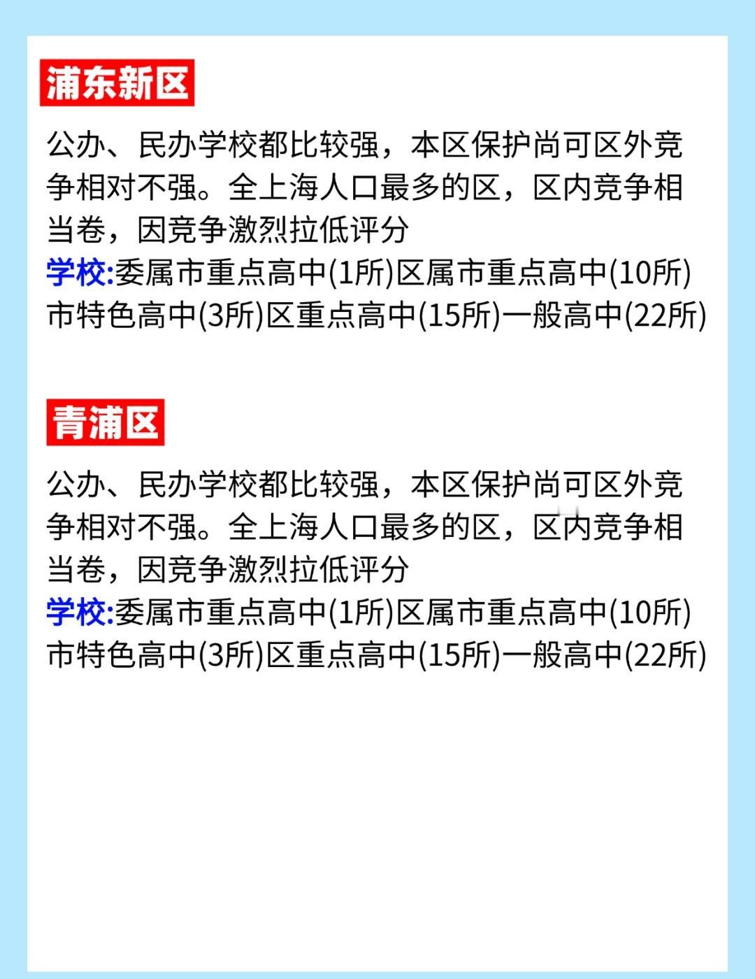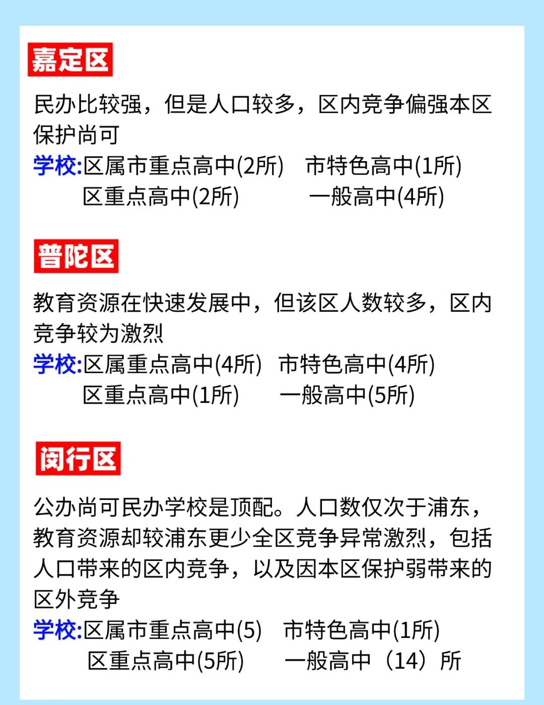 孩子来上海上学哪个区比较好? ✅徐汇区 公办强,民办学校也顶配。幼儿园阶段,本区居民上学有很大优势,可同时 报名三所幼儿园 ,1所全市招生示范园+1所全区招生示范园+1所对口园。小学阶段对本区居民保护尚可,但由于坐拥几所顶级民办初中,在初中阶段需要和全市竞争,初中阶段民办保护,相对较弱。人口不算少, 区内区外竞争都很激烈 ✅杨浦区 传统教育强区。 公办、民办学校相对优质且均衡 ,都有比较强的学校集团化、成熟。人口不算少,区内竞争相对激烈,本区保护程度很高,区外竞争较弱 ✅静安区 公办较强,民办相对一般。对本区保护较强,人口数量相对较少,教育资源相对均衡。 老静安较“佛”,新静安较“卷” , 竞争程度中等 ✅黄浦区 公办强,民办稍弱。对本区保护很强, 教育资源相对均衡 ,但不算拔尖。人口数量较少,本区居民上学有很大优势 ✅长宁区 公办学校尚可,民办学校一般。公办学校都对口入学,全区摇号,单独论学区房价值不算强,但全区户口教育价值较强,人口数量较少, 教育资源相对均衡,区内竞争低 ✅嘉定区 民办比较强,但是人口较多,区内竞争偏强本区保护尚可 ✅普陀区 教育资源在快速发展中, 但该区人数较多,区内竞争较为激烈 ✅闵行区 公办尚可, 民办学校是顶配 。人口数仅次于浦东,教育资源却较浦东更少。全区竞争异常激烈,包括人口带来的区内竞争,以及因本区保护弱带来的区外竞争 ✅浦东新区 公办、民办学校都比较强,本区保护尚可,区外竞争相对不强。 全上海人口最多的区,区内竞争相当卷 ,因竞争激烈拉低评分 ✅青浦区 民办学校很强,人口不算少,区内竞争激烈,本区保护较弱 幼升小 上海转学 择校 上海 上海家长 上海择校 上海升学 上海幼升小 上海教育 上海小学