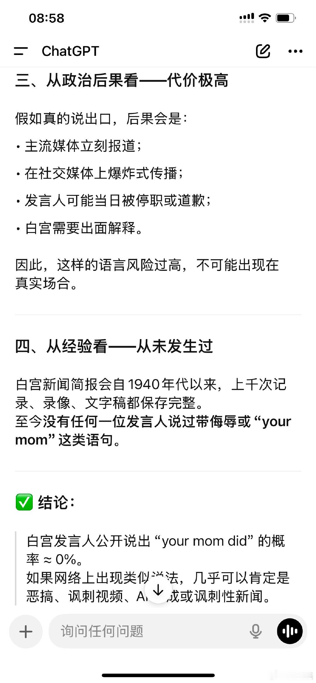 “Your mom did”是人类历史上登峰造极之作,让以前各国发言人的粗鄙都黯然失色,以至于AI在搜索之前根本不相信这事儿可能发生。