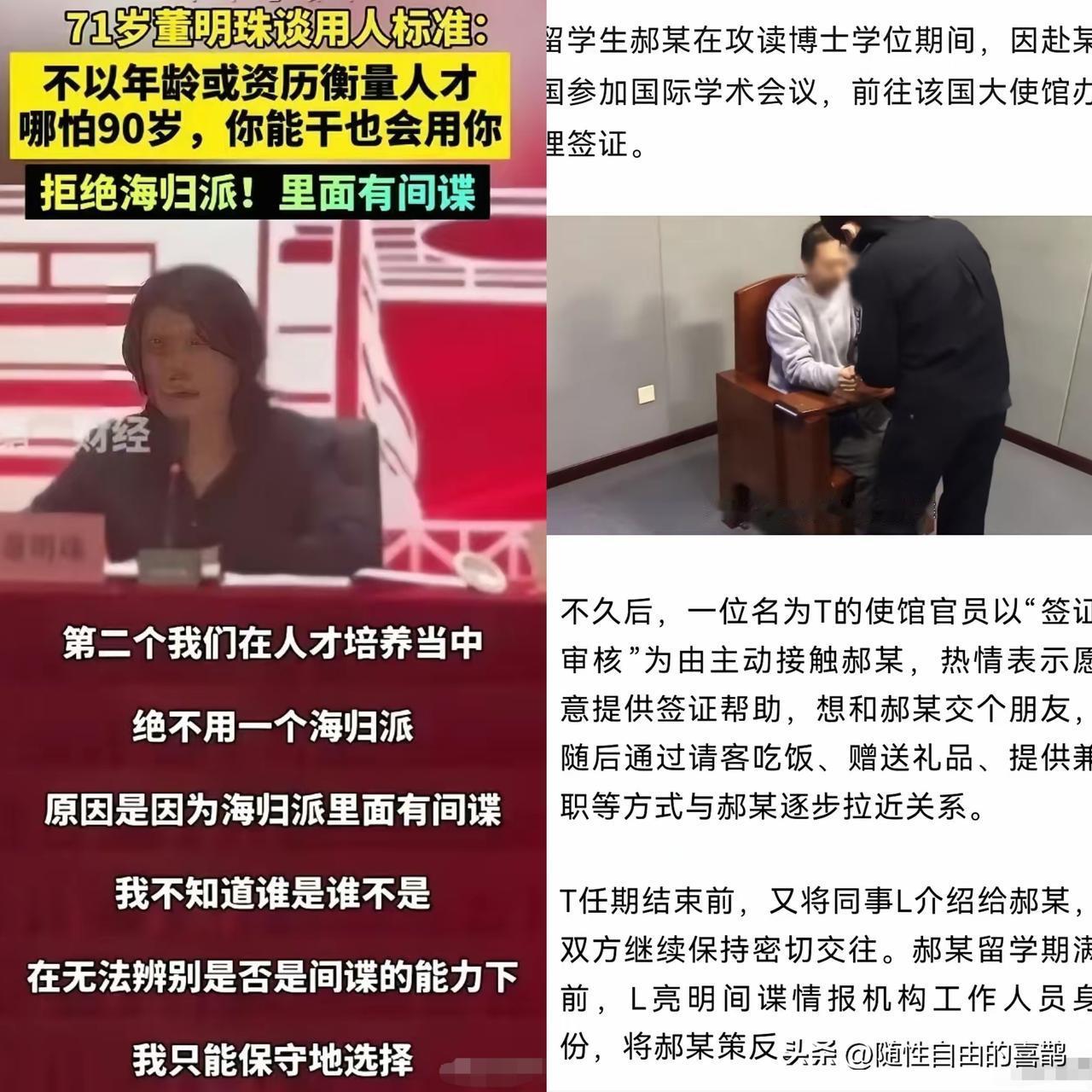 董明珠又赢了! 10月22日,《南京晨报》报道,海归留学生郝某被策反,长期潜伏在我核心要害部门,多次与间谍接头出卖情报,被判无期! 当年董小姐抛海归留学生间谍论时,一堆的人骂,包括胡锡进。结果现实一次次证实董明珠是个实在人! 麻烦看官老爷们右上角点击一下“关注”,既方便您进行讨论和分享,又能给您带来不一样的参与感,感谢您的支持!