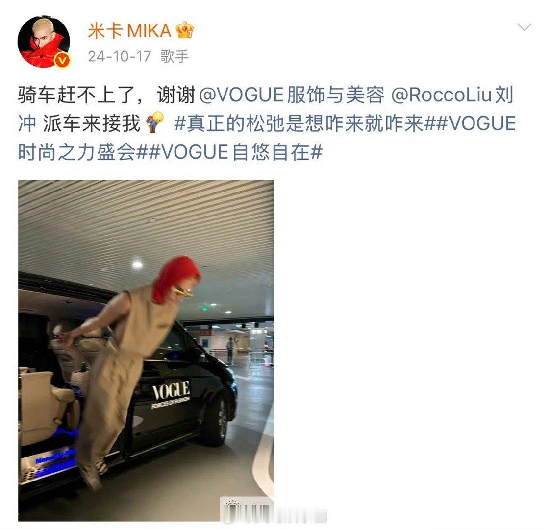 米卡去VOGUE抖的包袱比小品好笑 米卡把VOGUE活动玩成喜剧现场!蹬单车、喊刘冲派车、红毯露背扛布,连18宫格出发图都藏梗,还能串成“连续剧”,笑点密集到像批发来的。今年全勤不说,活儿还整不完,太有梗了!